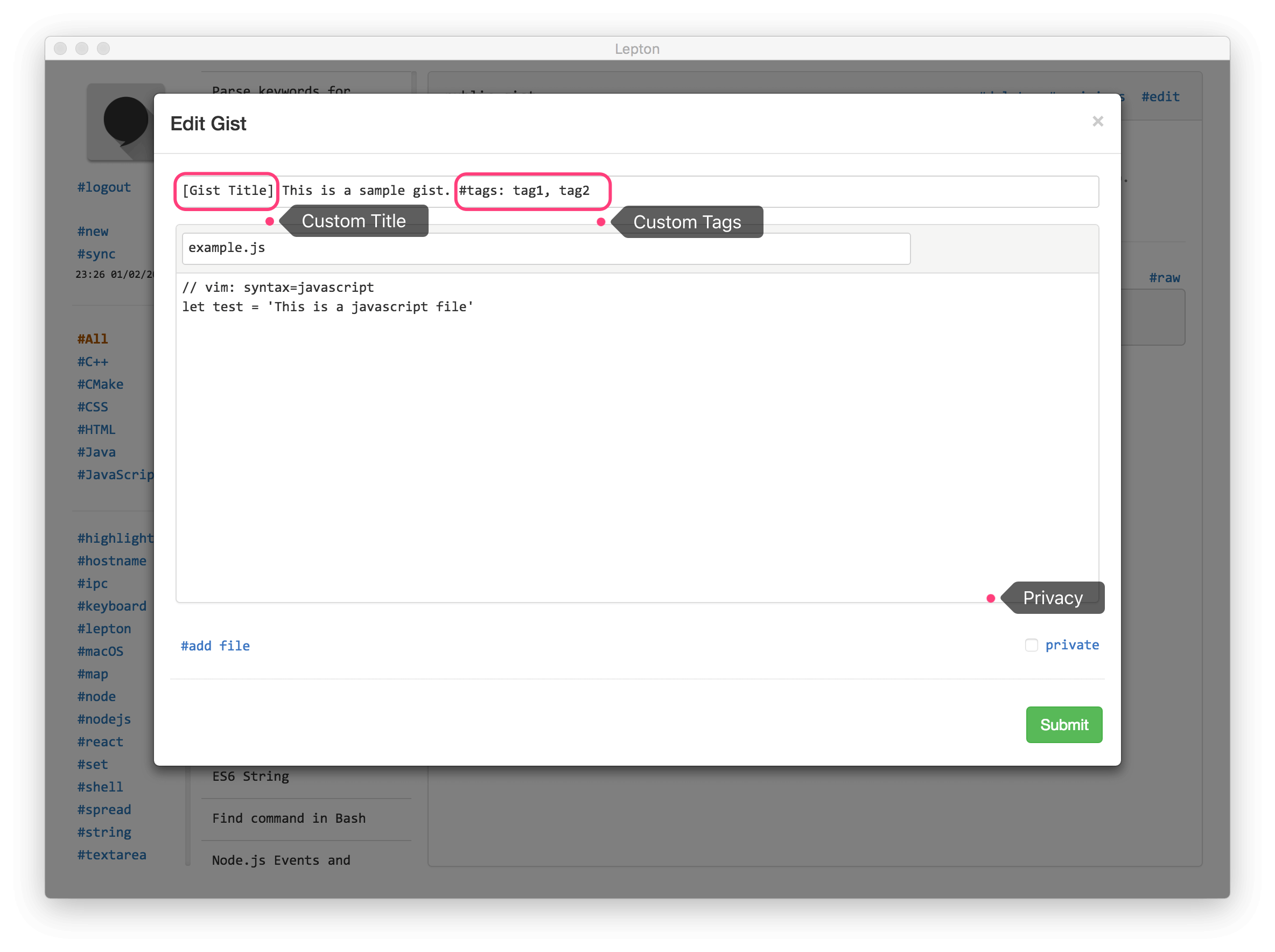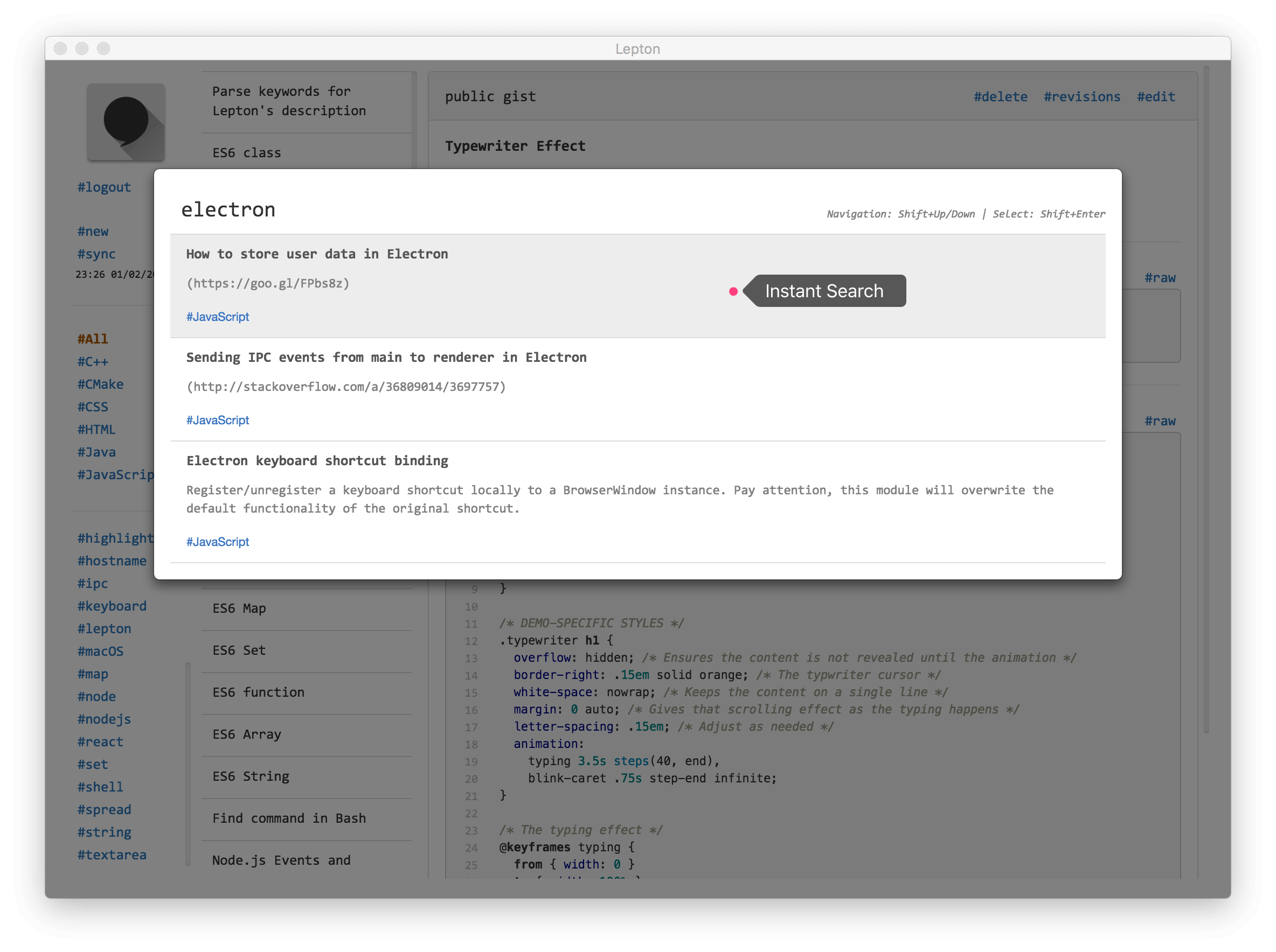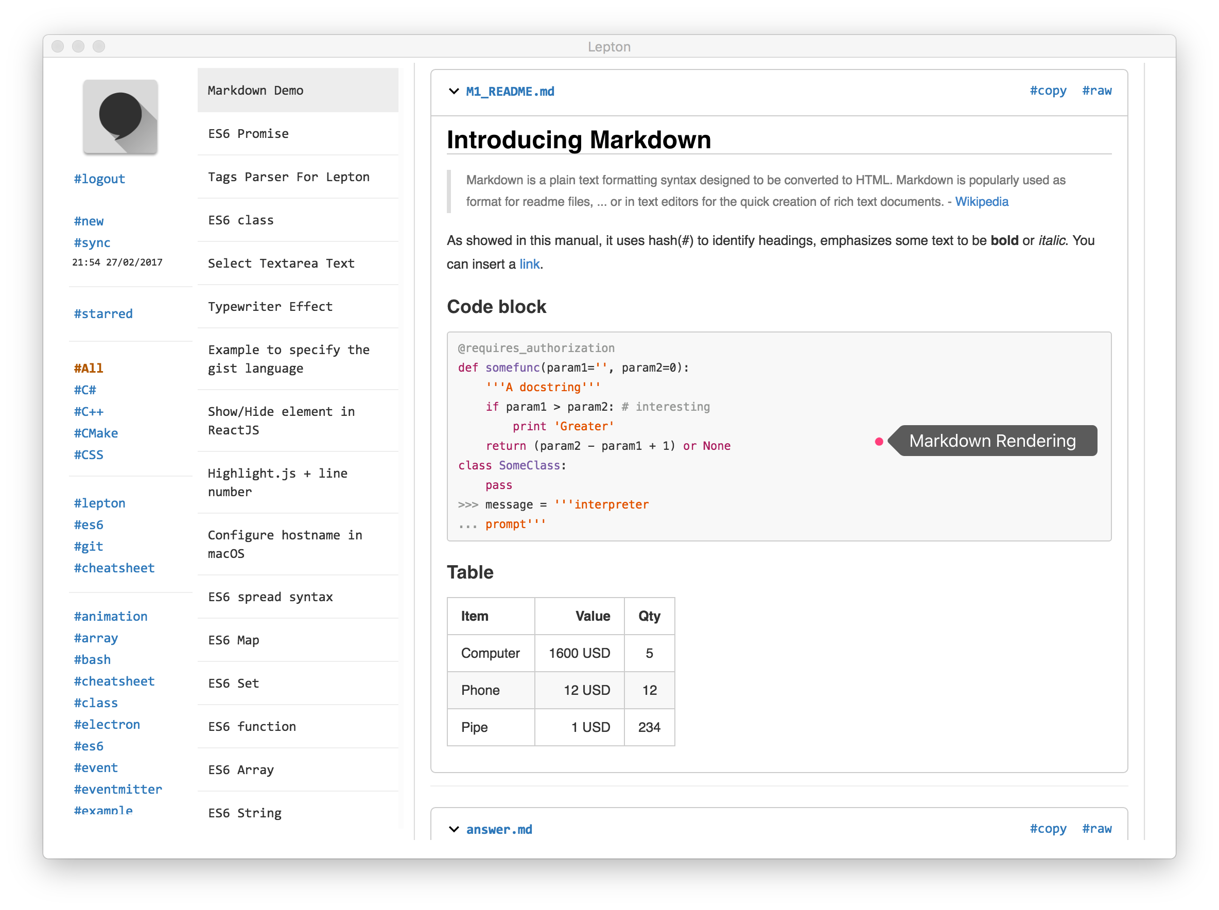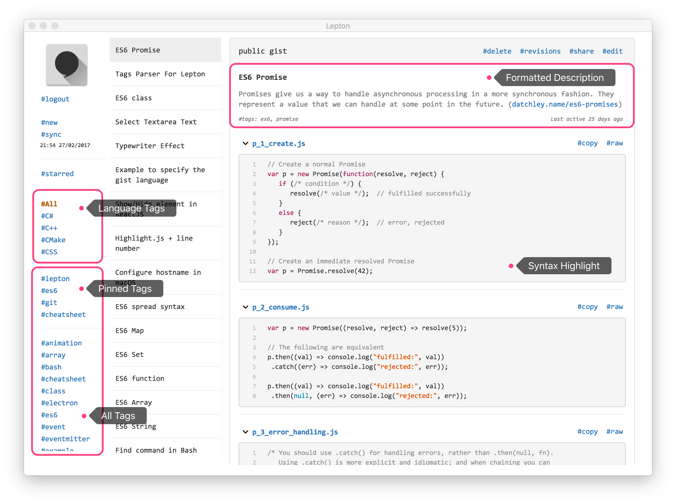 Hello hunters! Lepton is an open source snippet app backed by GitHub Gist. It provides features like tags, local search, syntax highlight, Markdown rendering, note sharing and immersive reading mode. Thanks to Electron framework, Lepton is now available on Mac, Windows and Linux. Get your notes, snippets and ideas sync across platforms!