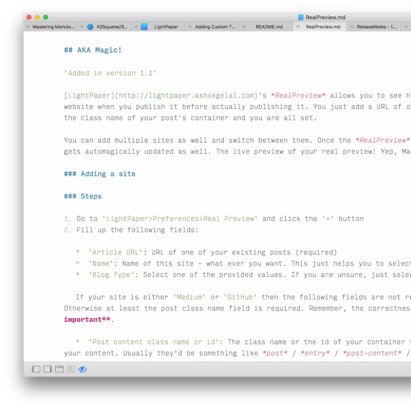 It's a cliché to say it but LightPaper is not just "yet another text+MD editor". It is fast and light and looks gorgeous! We made it with a purpose: to make it easier for you to write your documents and take notes whether you are a developer, a blogger or a student.