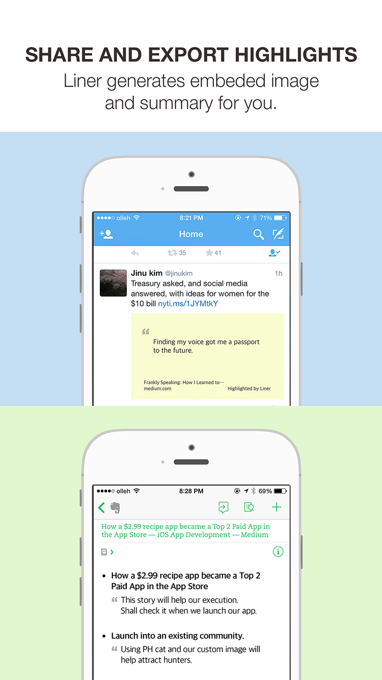 Our mission is to build useful softwares that make it easier for people to find and consume information. Liner is our first product. You can highlight any web page and share it with Liner. When you share on Twitter, an embedded image is automatically generated.