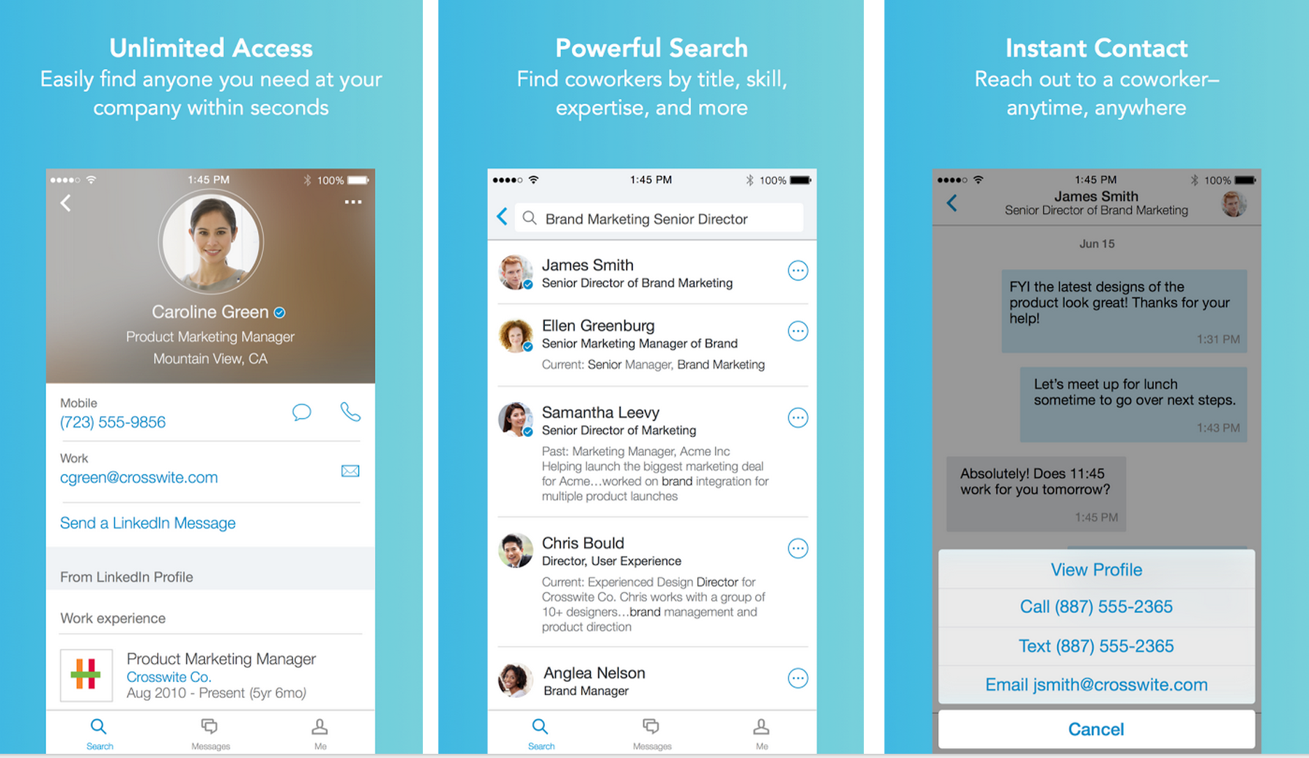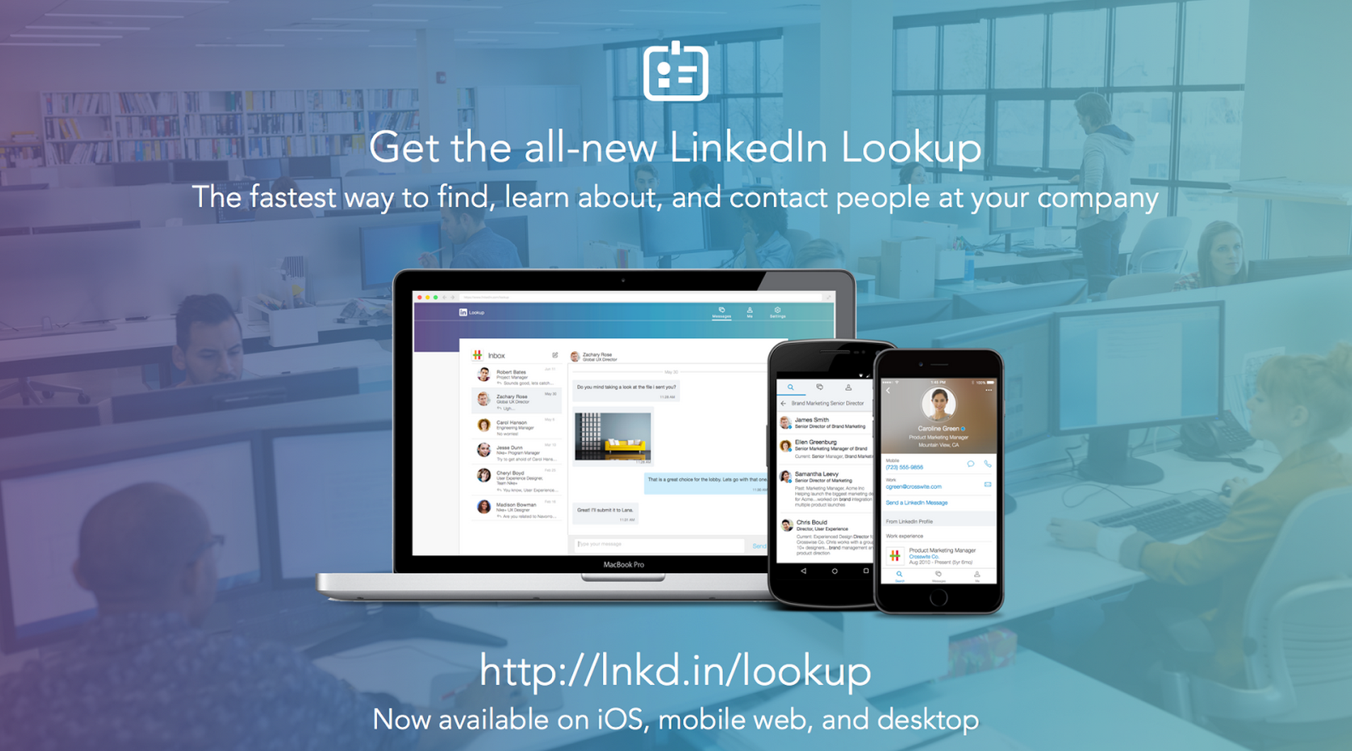 We are thrilled to introduce LinkedIn Lookup! We found that corporate directories are outdated (and not mobile!)... and wanted help LinkedIn members to be more successful by building an easy way for our members to find, learn about, and contact coworkers in a very intuitive way. You can search by name, title, skills to find the right coworkers you need, and … See more