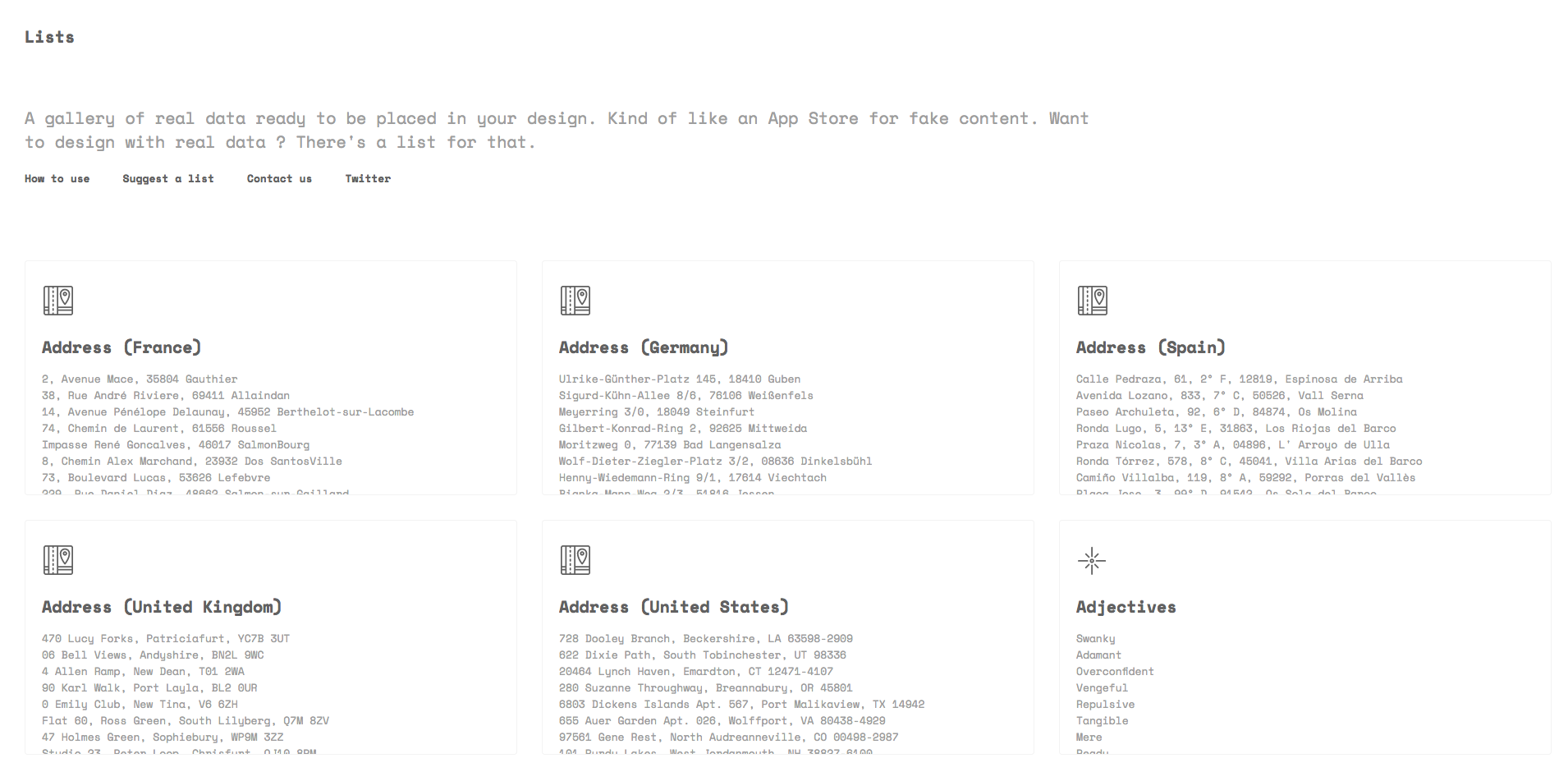 Lists is a gallery of realistic data to help designers be more efficient. I was missing this kind of tool, so I built it and decided to make it public. It's really simple, but I think it could be super useful to all of you. It works really we… See more