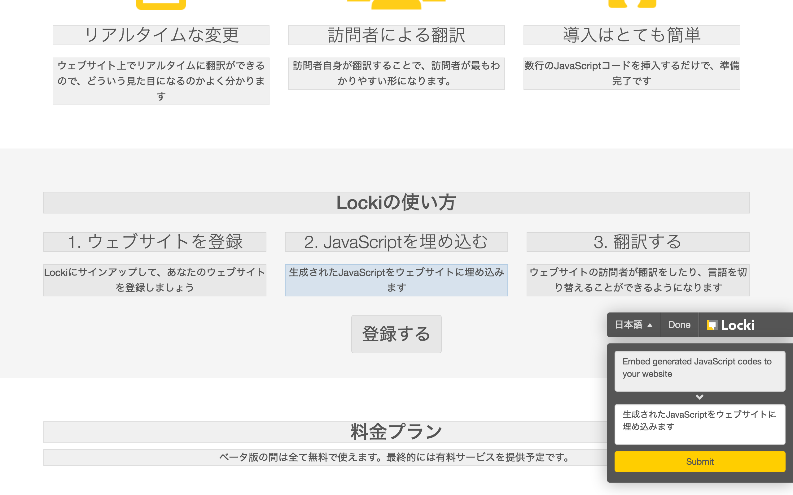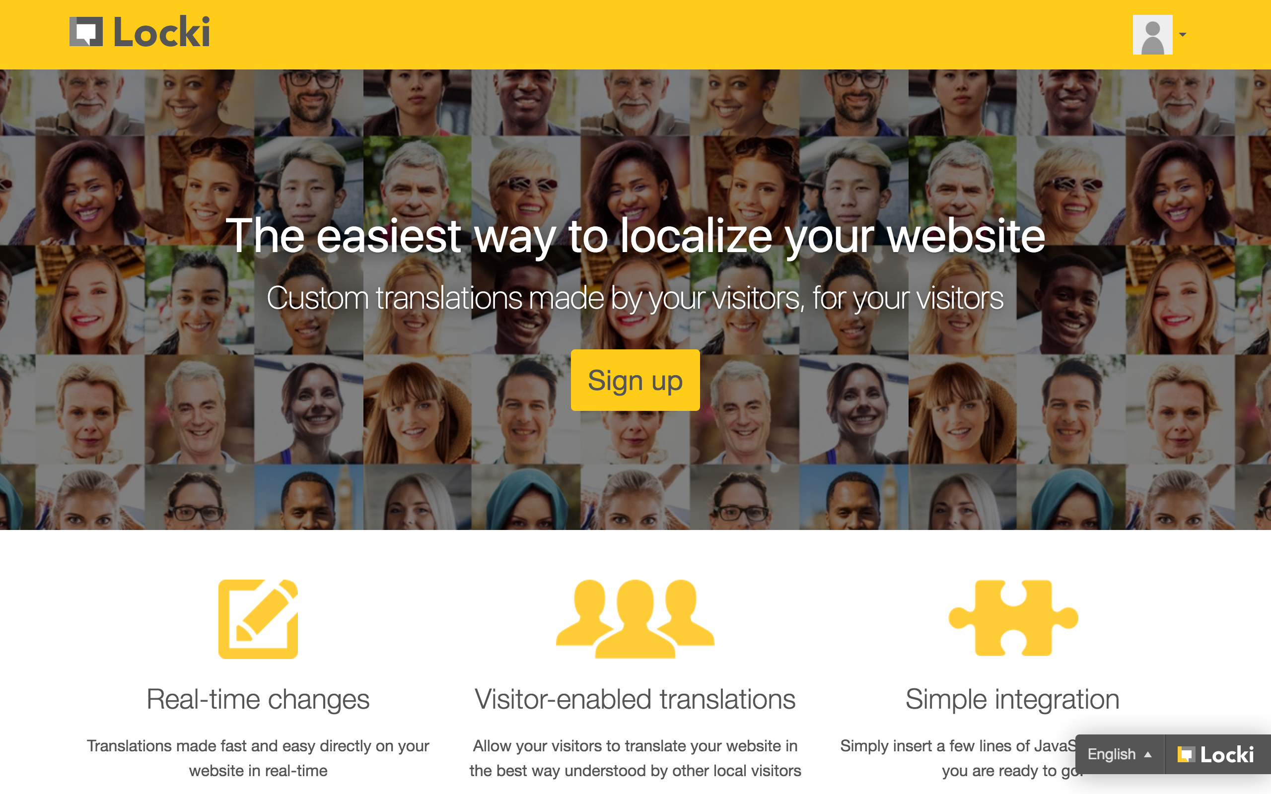 Locki is a website localization tool that enables your website’s visitors to translate your content right on your website. All you need to do is registering your website to our platform and embedding a few lines of JavaScript to your HTML, then ready to go.