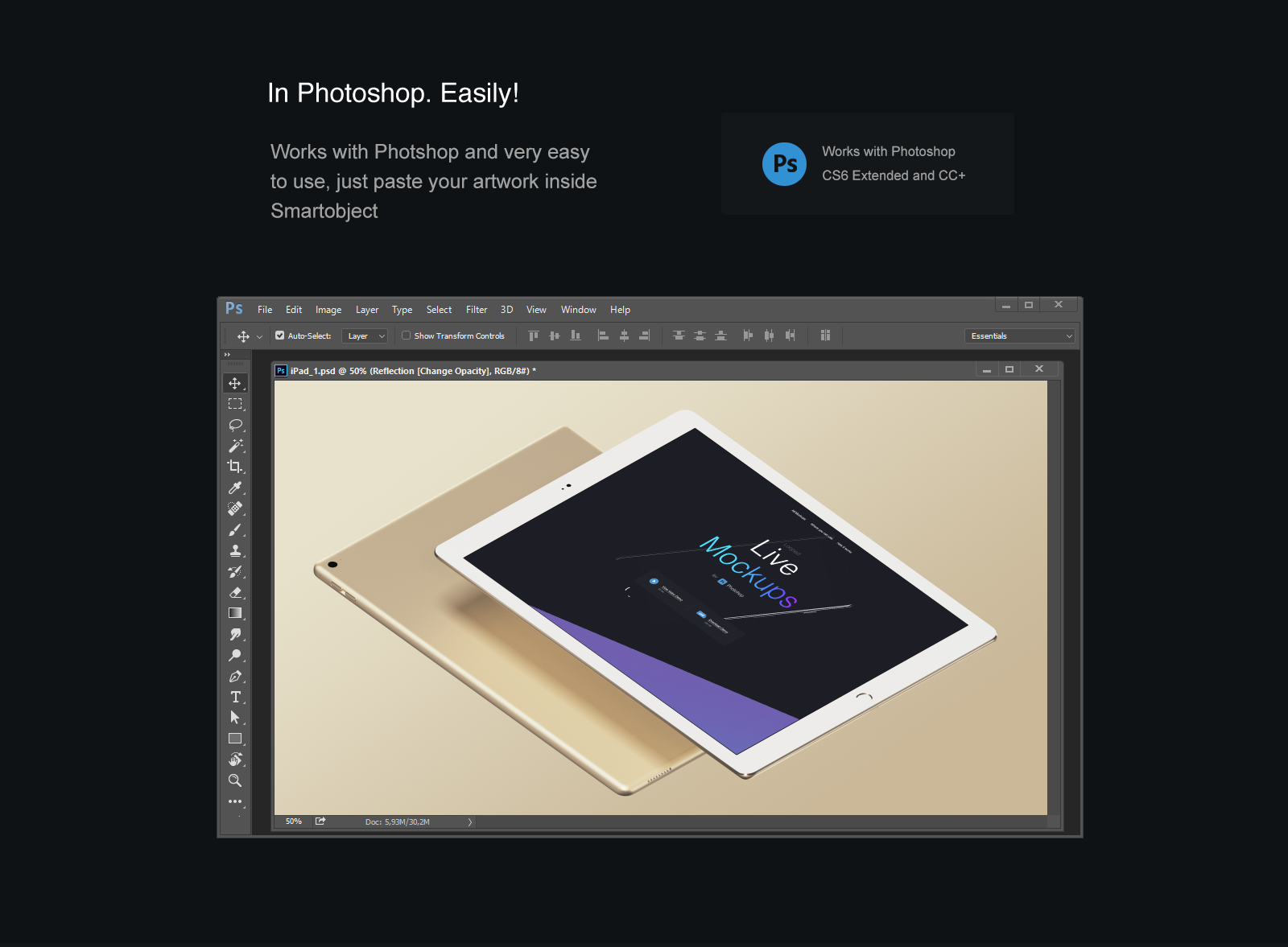 Live mockups work with Photoshop and are very easy to use, just paste your artwork inside a Smartobject!