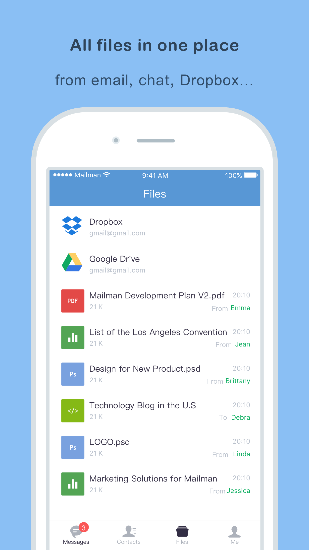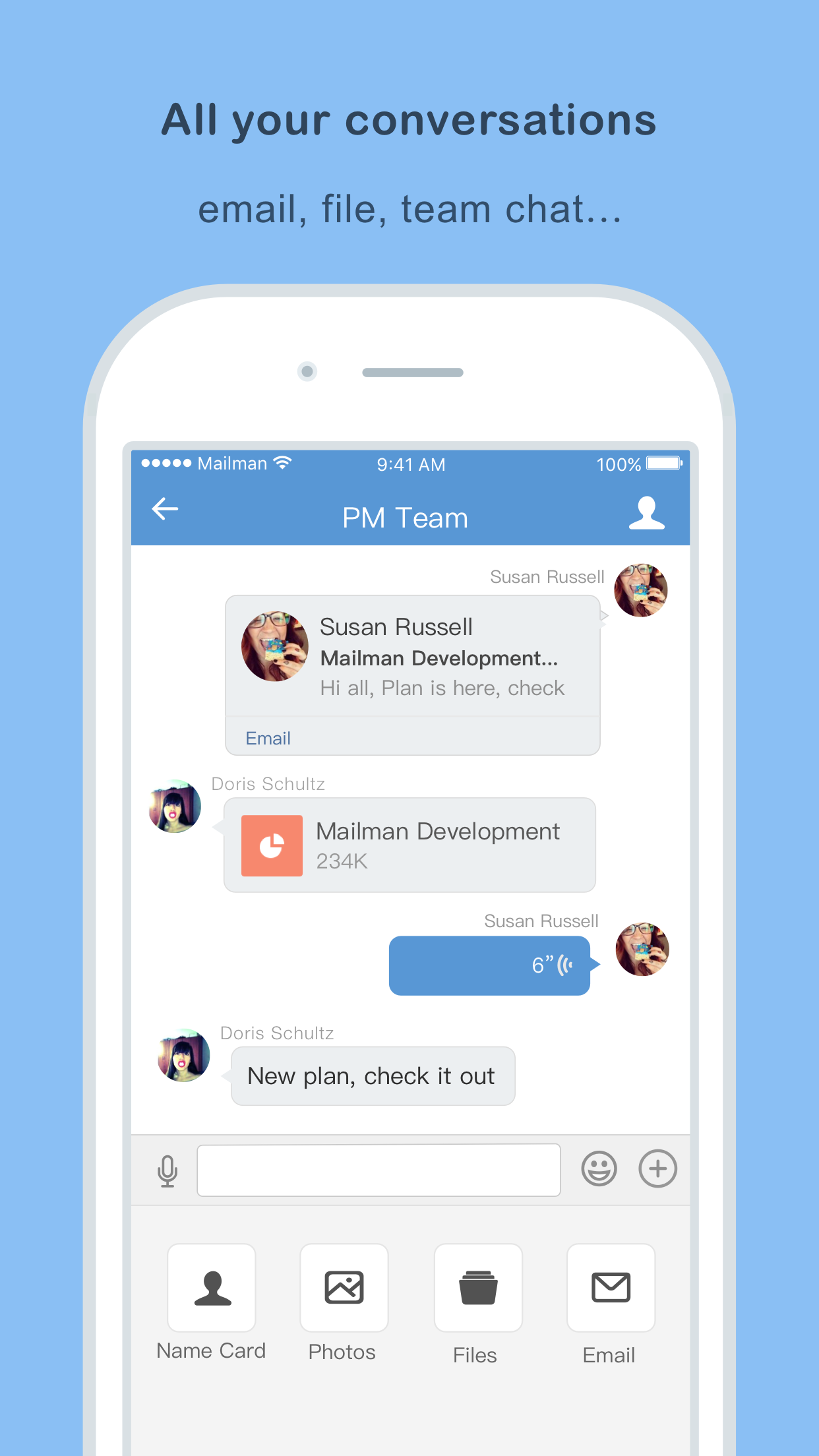 • We help you manage your inbox by groups or people and turn your messy email threads into chat-like conversations.