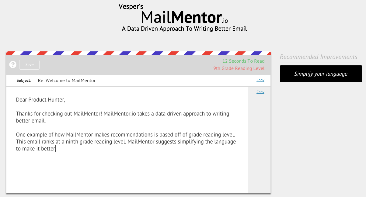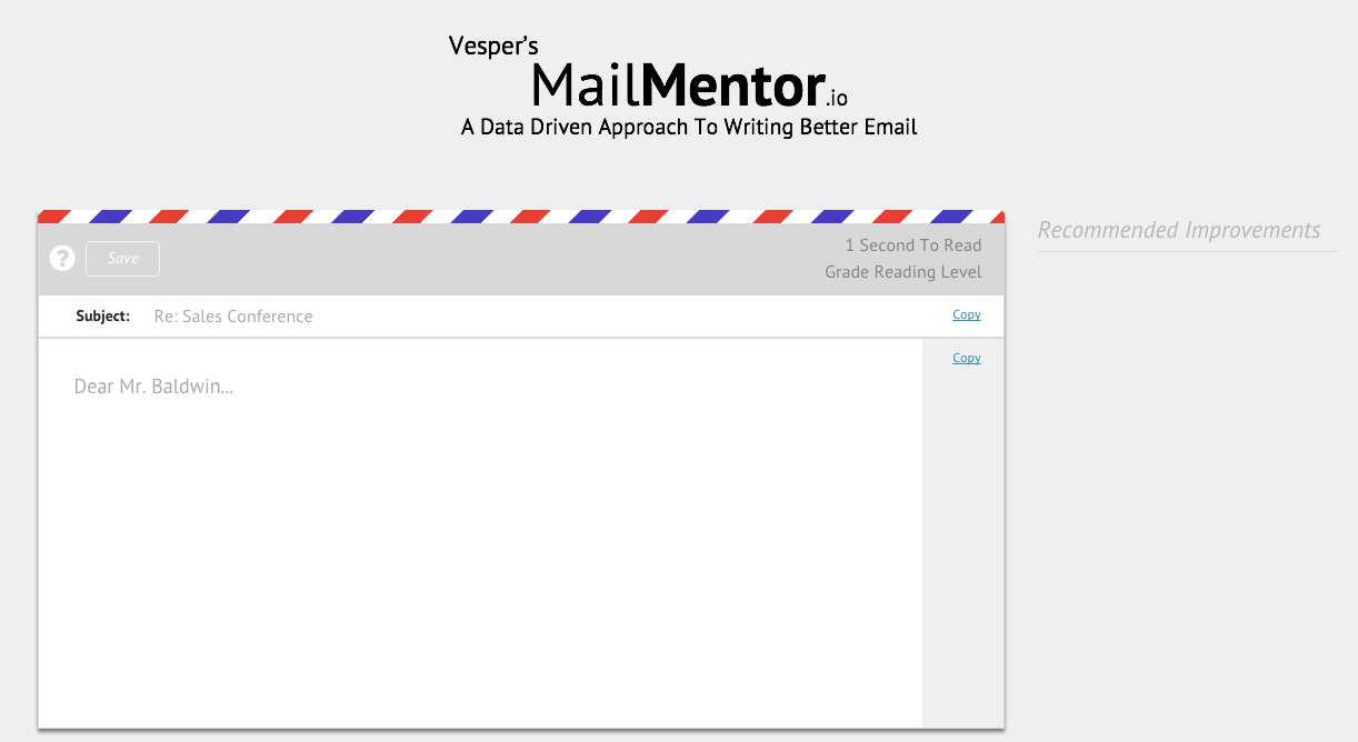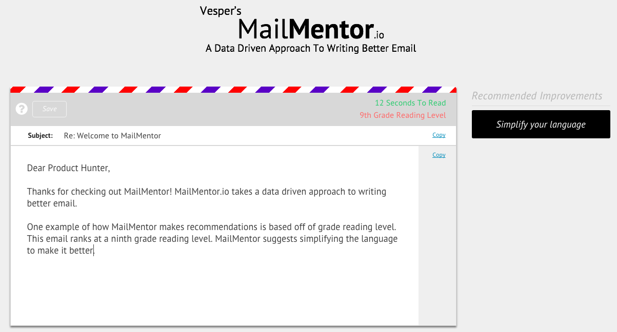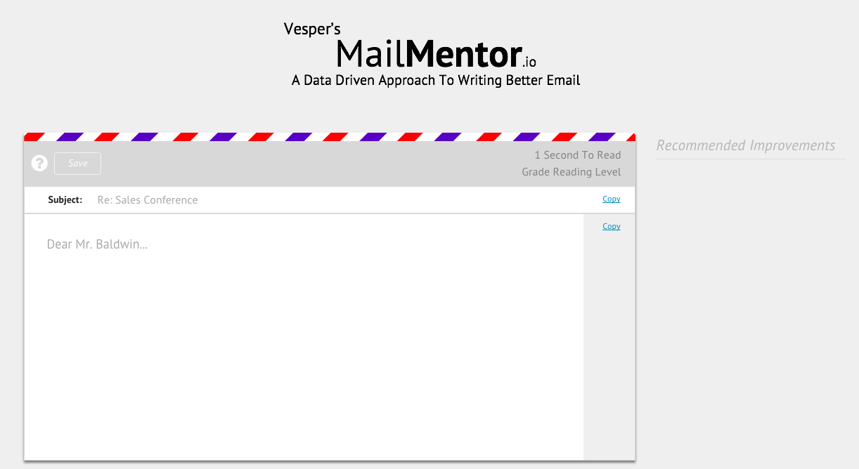 @jsfour - Cool product. Seems like there are a lot of directions you could take this. What is the next piece you want to connect? More data? More specific recommendations? Integrate with gMail so I don't have to copy/paste? Team leaderboard of whose emails are kicking everyone else's ass?