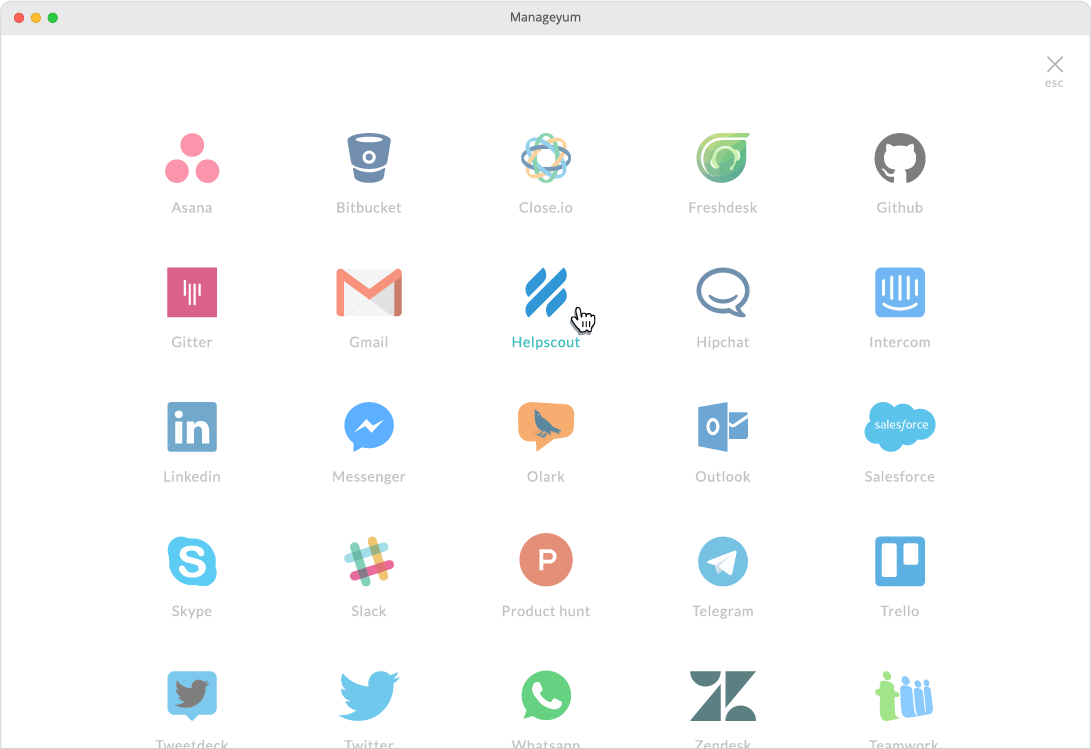 Been using Manageyum for a couple of days now. I can manage not just messaging apps but also services like intercom, freshdesk, close.io, salesforce & more importantly Product Hunt :D. Switching from Franz app to Manageyum!