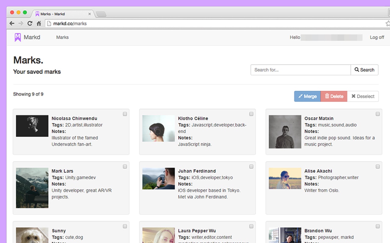 Use Markd to organise and reach out to creative talent, job candidates, sales prospects, or just for marking interesting people that you want to return to later. It's like Pinterest but for People!