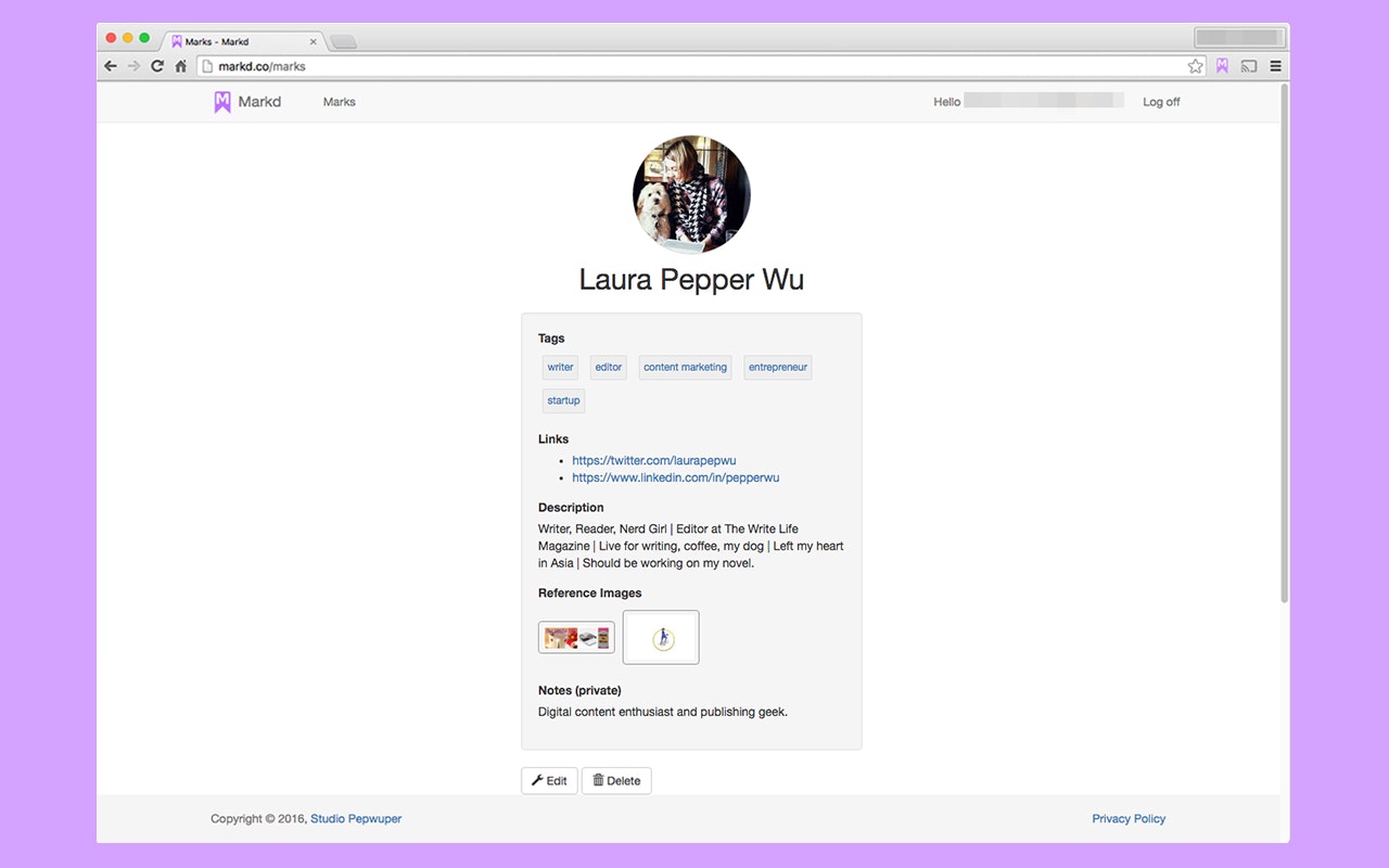 Wow I woke up on a cold and rainy morning to see this here - thanks so much for the ProductHunt love! Markd.co is a side project, created from a personal need to have a quick and easy way to remember people I find online - I'm so glad others are finding it useful, too. You can read more about the back story here http://www.pepwuper.com/markd-pi...