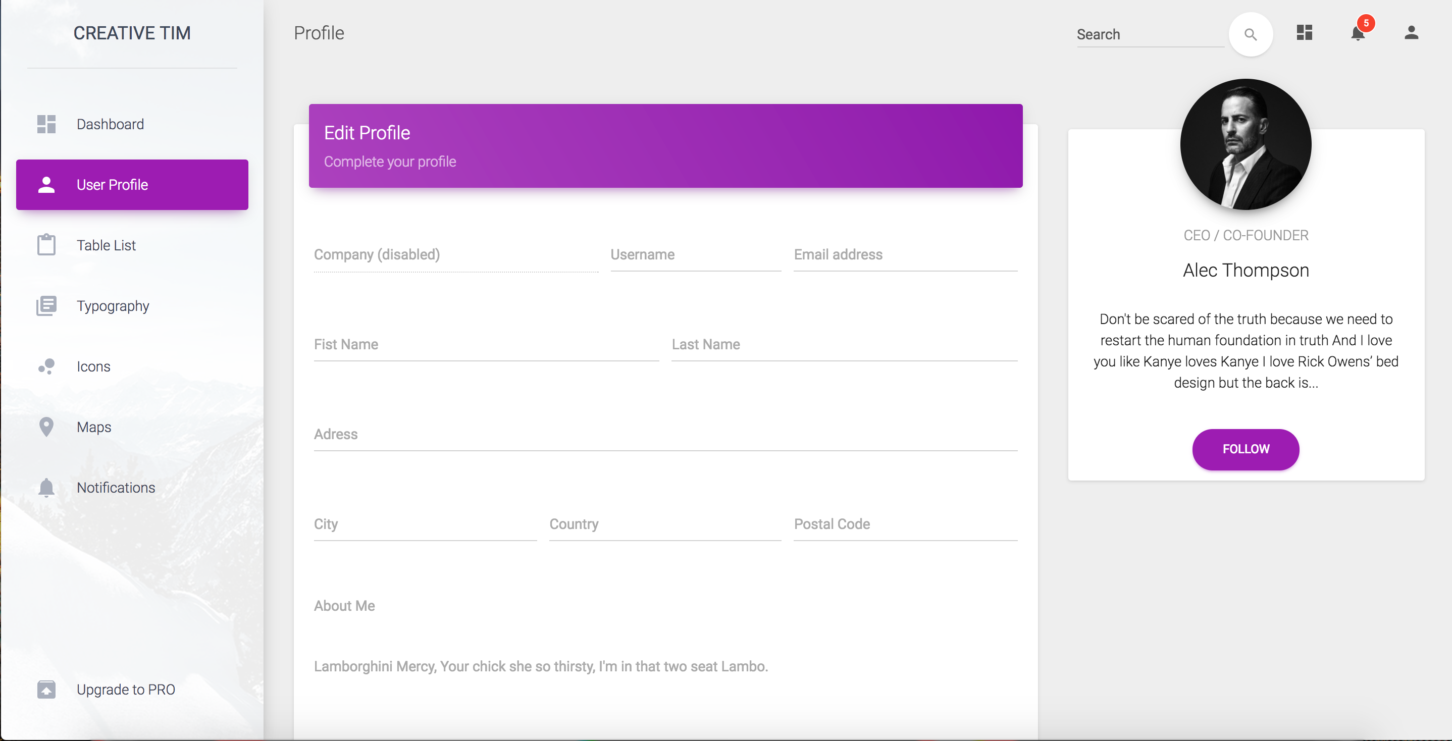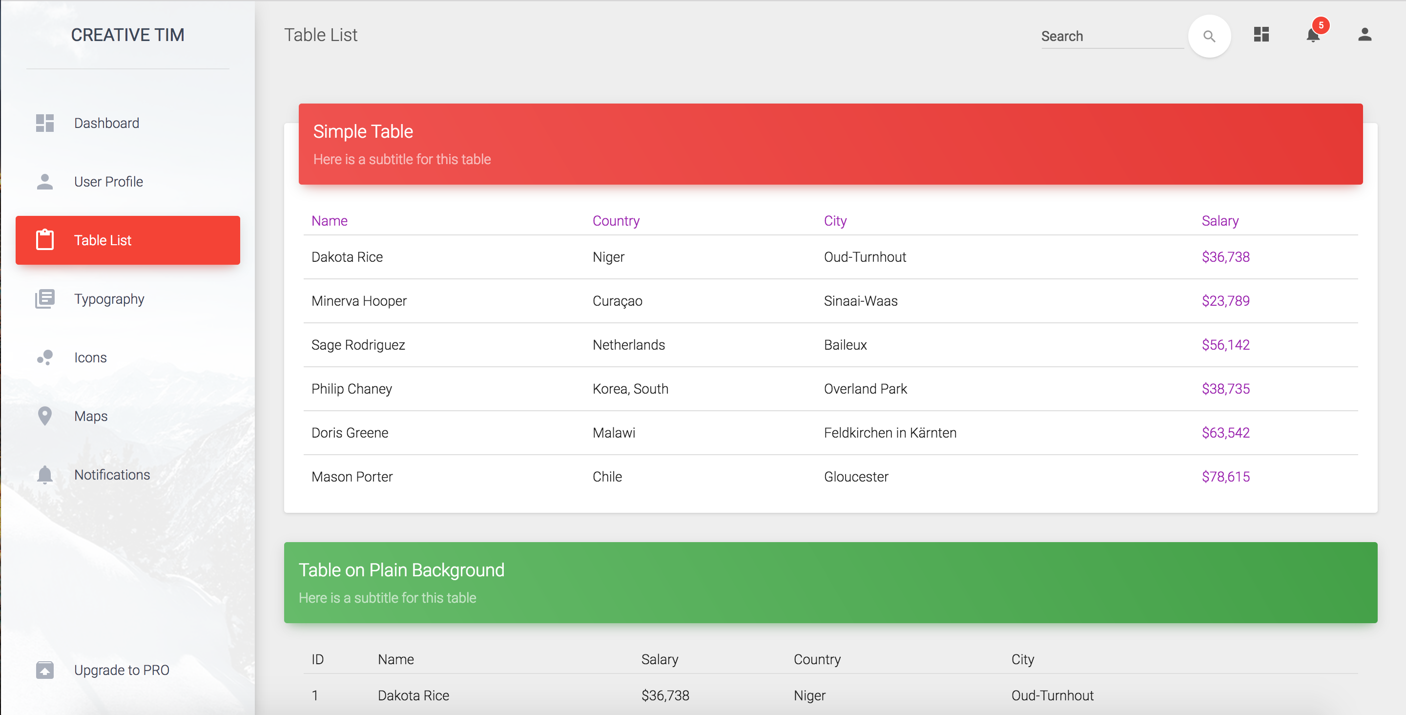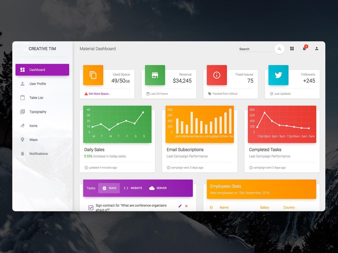 Hi! Here is Alex, one of the creators of Material Dashboard. Material Dashboard is a Free Bootstrap Admin built on top of Material Kit (http://demos.creative-tim.com/ma...) and Bootstrap Material Design (https://github.com/FezVrasta/boo...). It is including some redesigned libraries like Bootstrap Notify (https://github.com/mouse0270/boo...) and Chartist (ht… See more