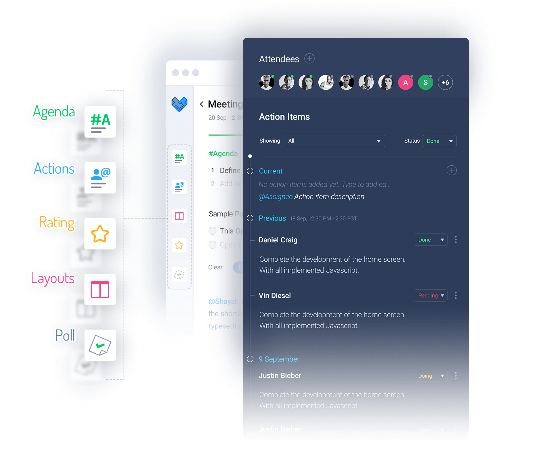 Meetnotes.co is the simplest way to take meeting notes and record action items for recurring meetings. We wanted a UX that allows touch typing without looking at screen - You just type in a collaborative editor and say @name-of-person and its c… See more