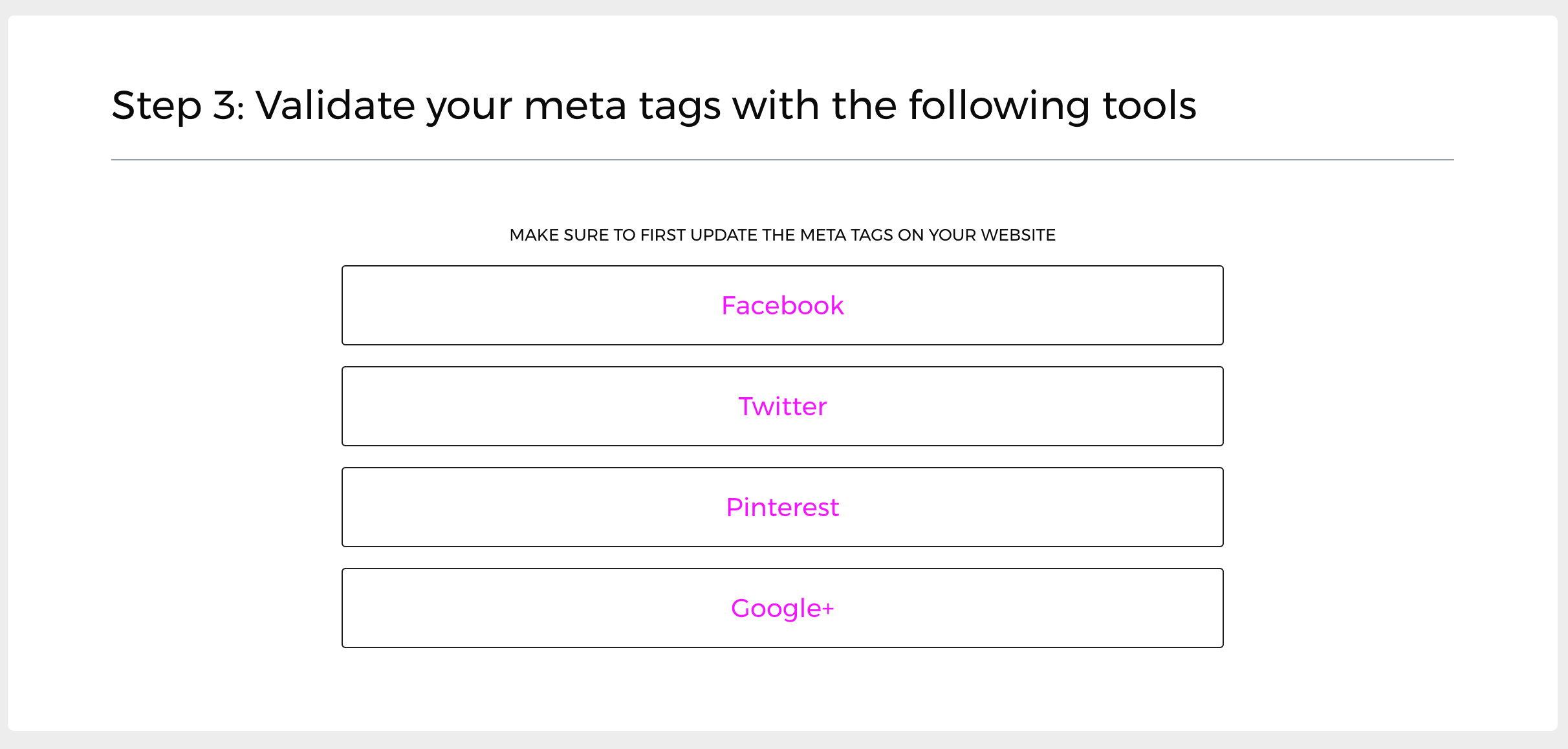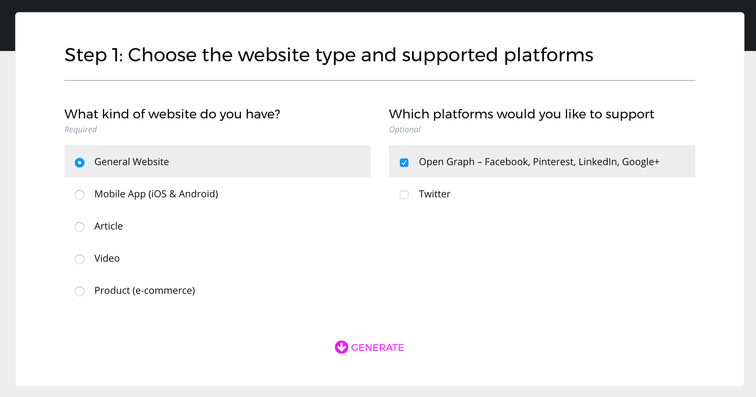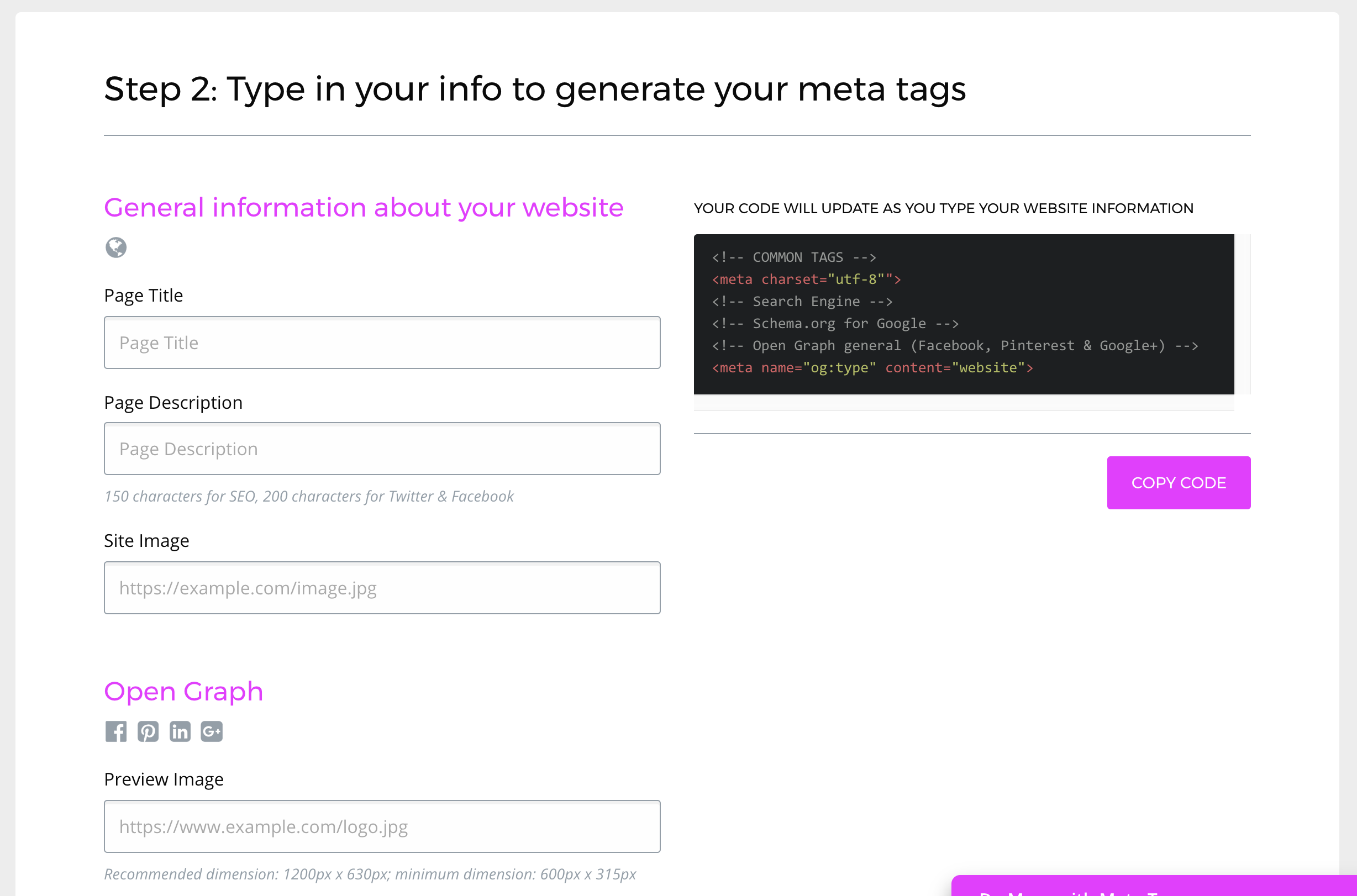 Plug in your site's information and generate the most accurate social media meta tags for Twitter, Facebook, Pinterest, LinkedIn, and Google.