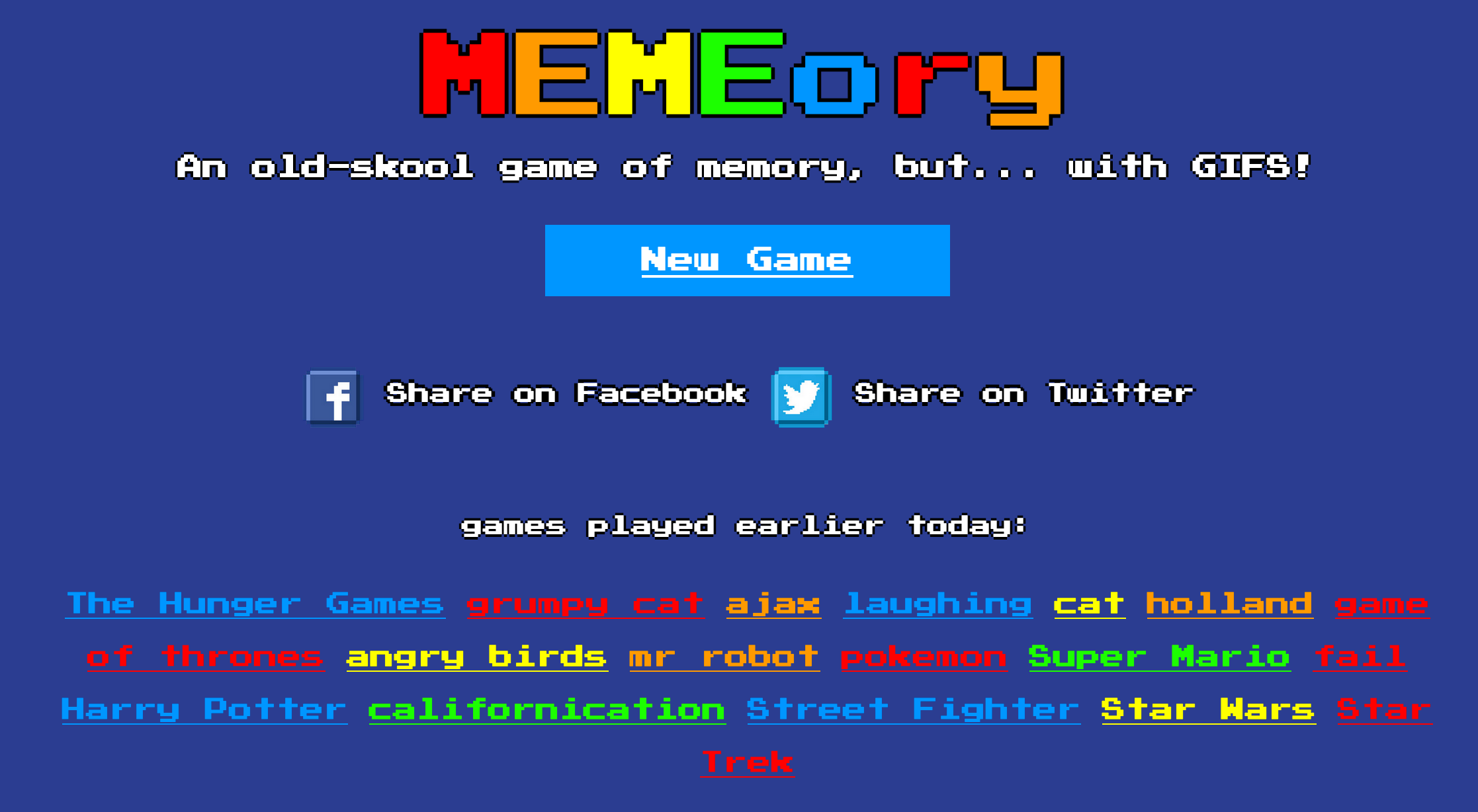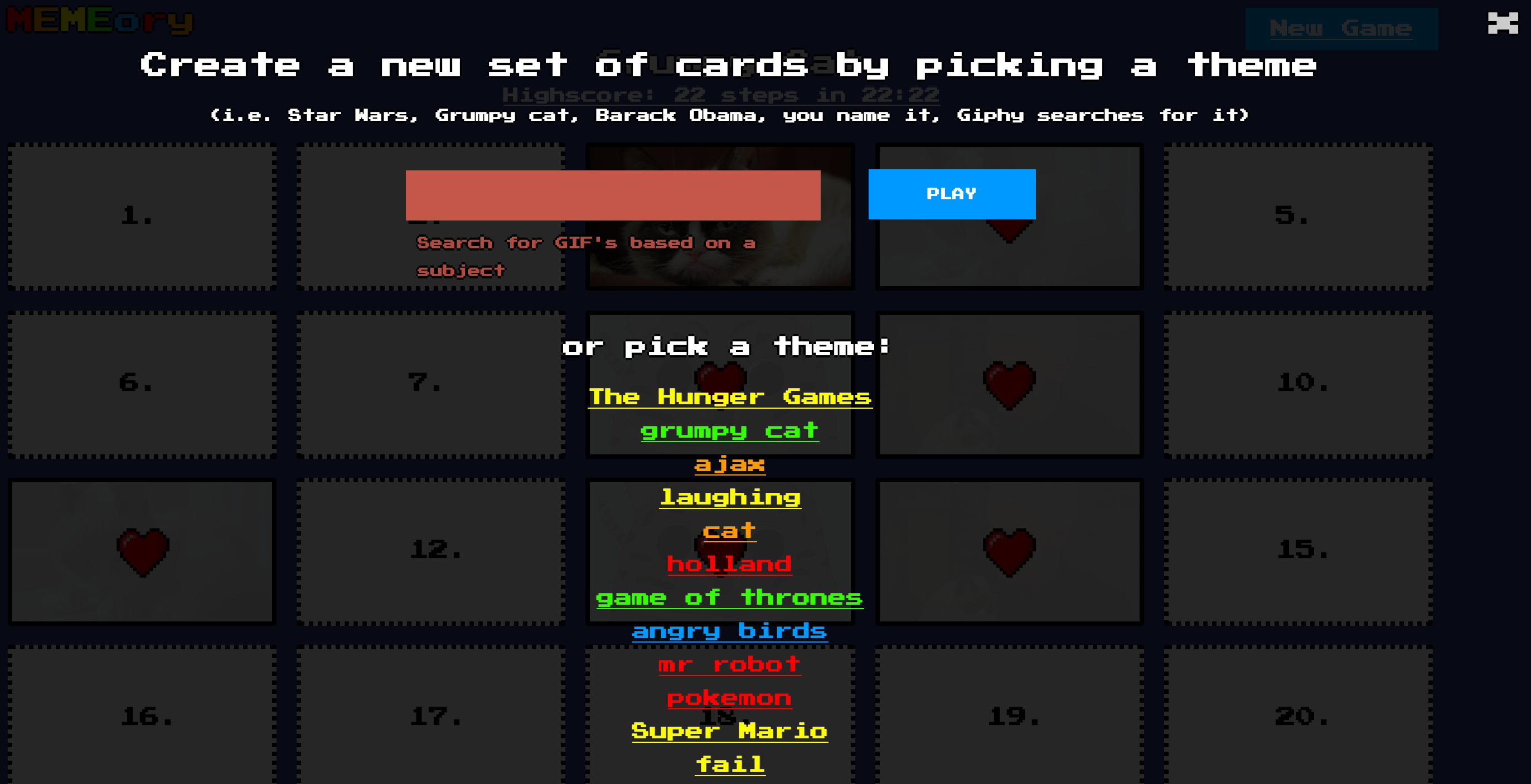 About MEMEory: everybody loves GIFS and everybody loves old-skool games, so why not combine the two into something fun? Memory get a lot more entertaining when some crazy animations are running, especially with 20 grumpy cat's rolling around the screen. Wanted to created som… See more