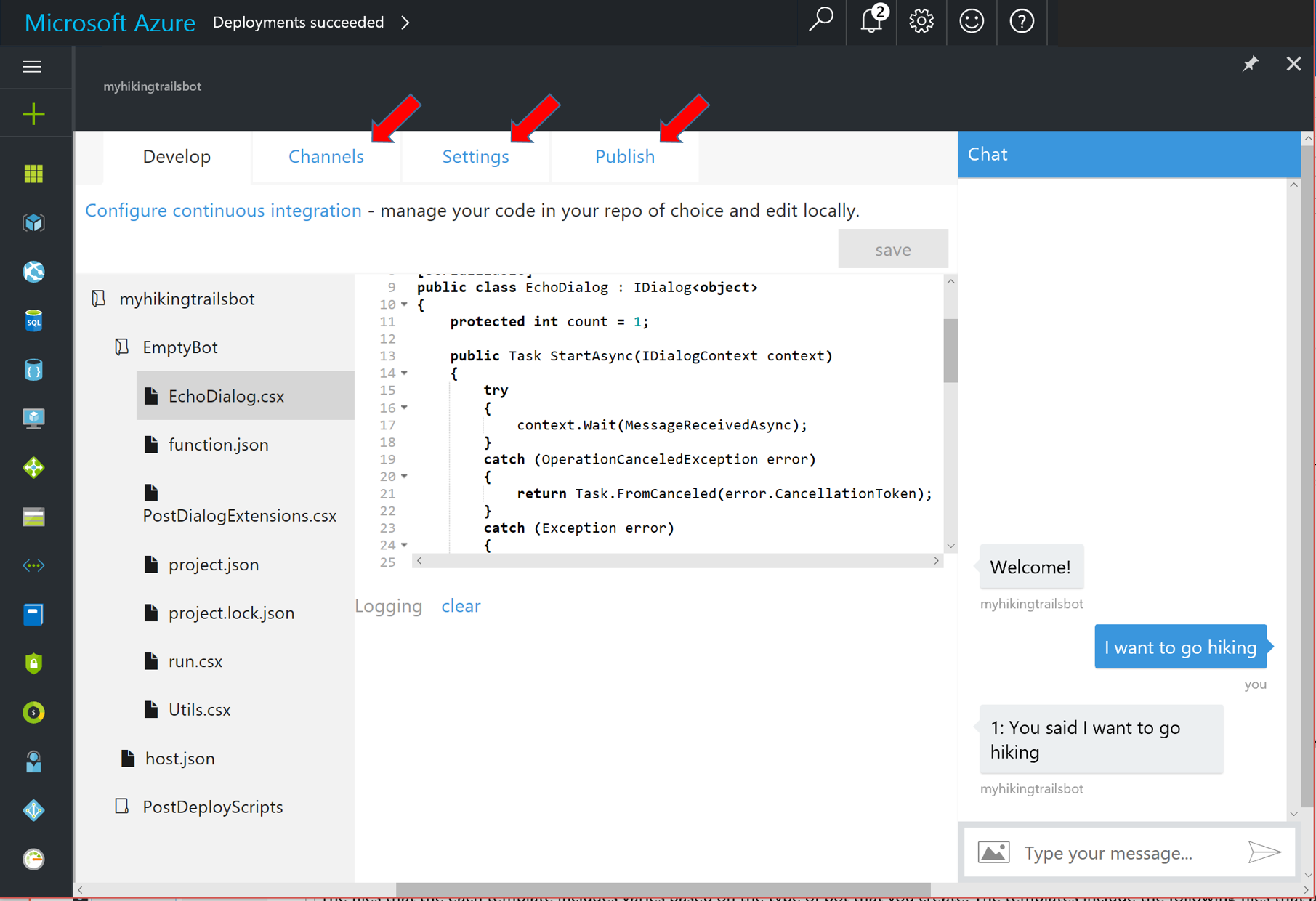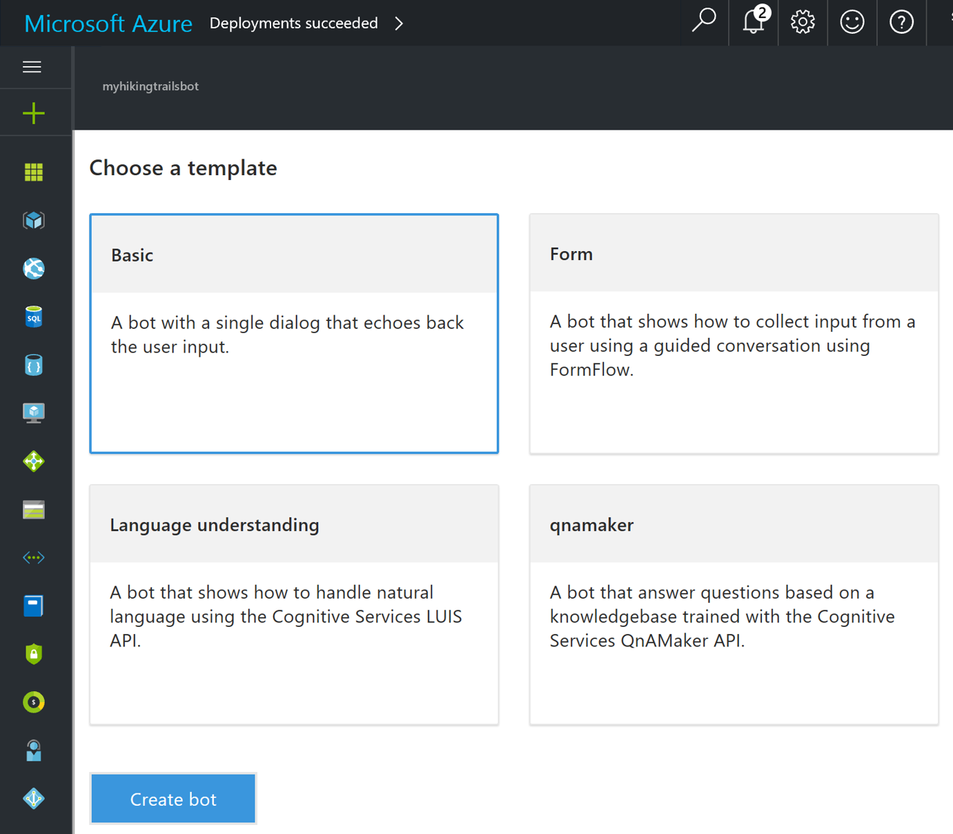 Azure Bot Service is the first public cloud bot-service powered by the Microsoft Bot Framework and serverless compute in Microsoft Azure. With this cloud service, you can build, connect, deploy and manage intelligent bots that interact naturally wherever your users are talking – from your app or website to text/sms, Slack, Facebook Messenger, Skype, Teams, K… See more