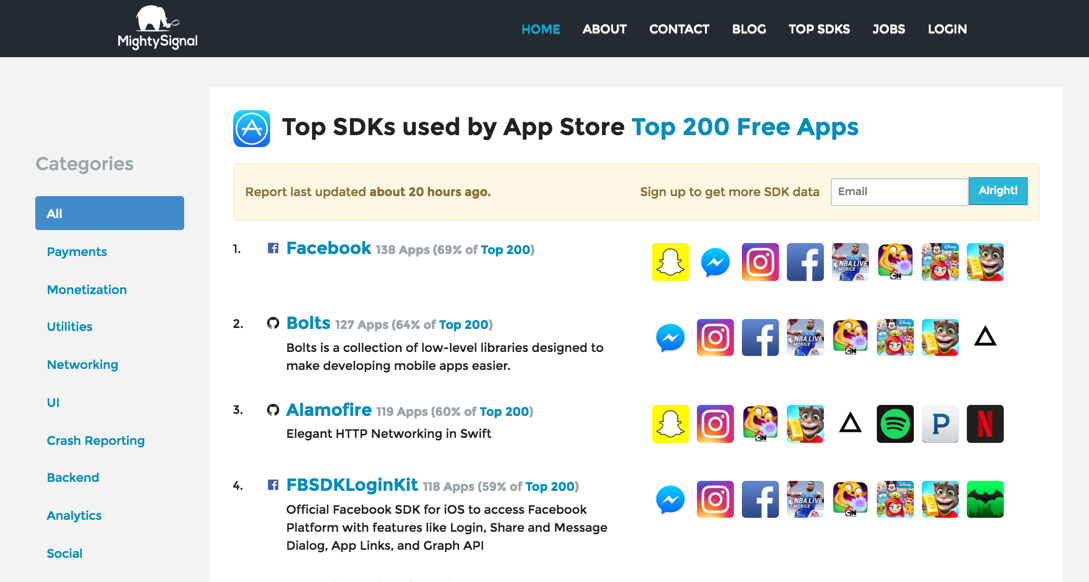This is Shane, one of the makers. Great to see the insights people are deriving! Happy to answer any questions. We worked on this project because as former mobile developers, we faced the problem of not knowing what SDKs were out there that could make our app better. MightySignal's paid product is for companies looking for sdk usage across the millions of ap… See more