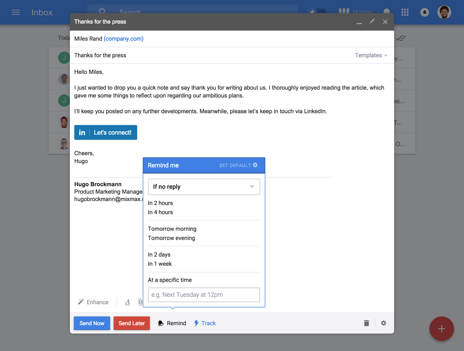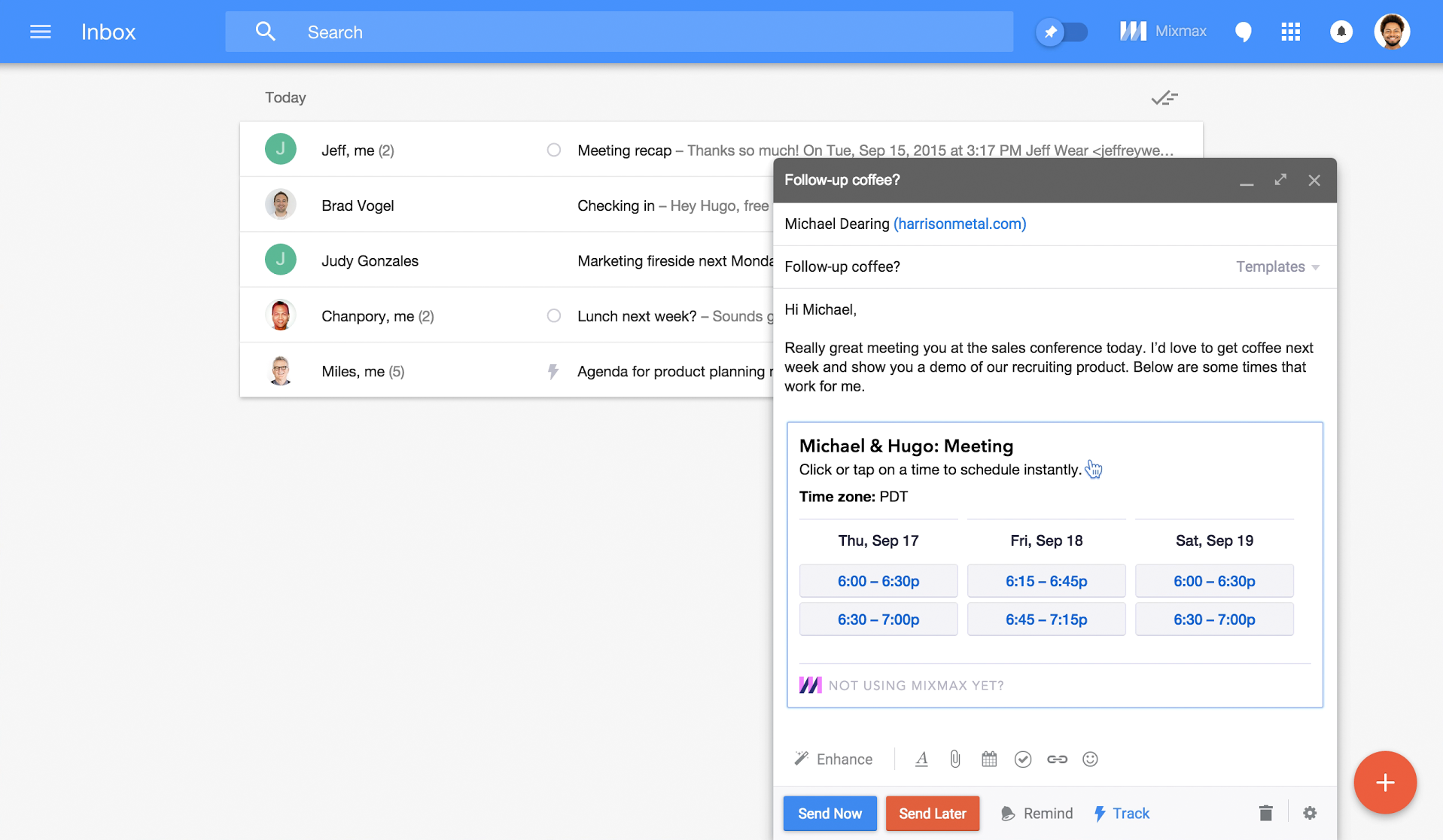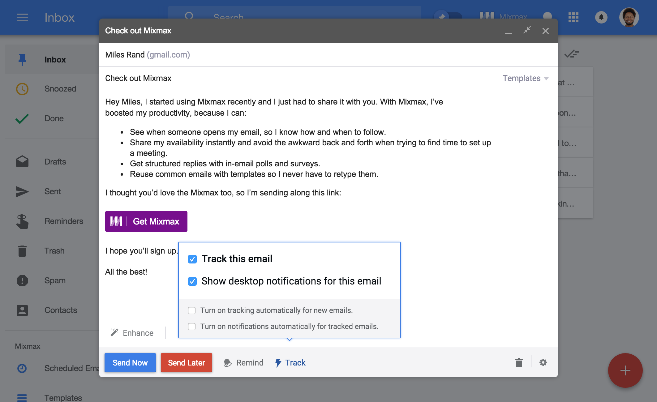 Ahoy! Excited to be on ProductHunt & share Mixmax for Google Inbox with the community! Mixmax turns Google Inbox into a viable product to get real work done with features like tracking, instant scheduling, shared team templates, and more. Our mission is to make your communications more effective and expressive. Making email into a productive medium is ou… See more