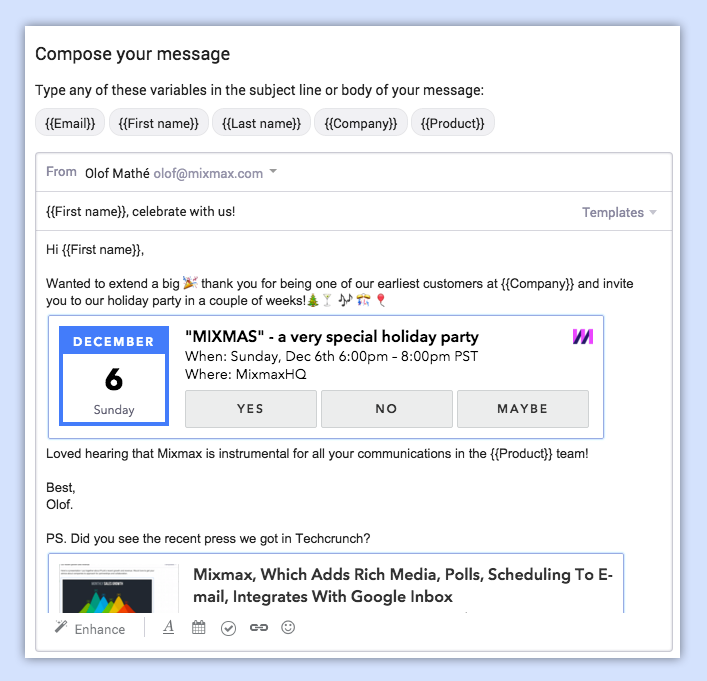 Just want to share that my product, GMass, provides similar, and actually, additional, functionality. GMass won't work alongside Mixmax though because of how they render the Compose window in Gmail. https://www.producthunt.com/tech...