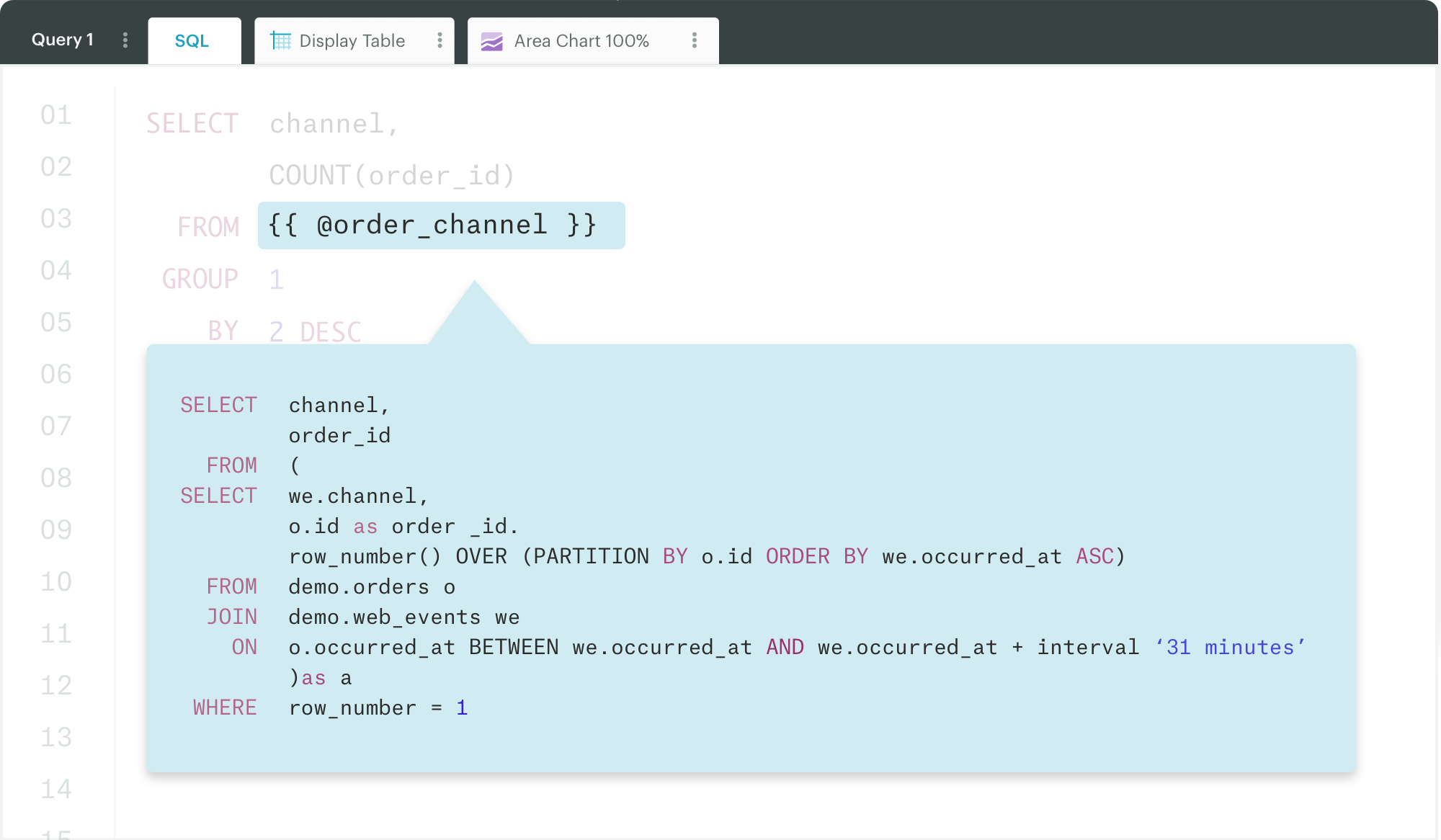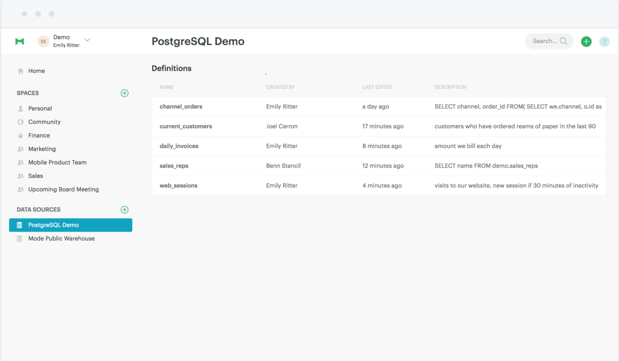 We get a lot of value from Mode. Definitions will help us a lot, I have at on of queries where I've copy and pasted the same bit of sql. Thanks Derek!