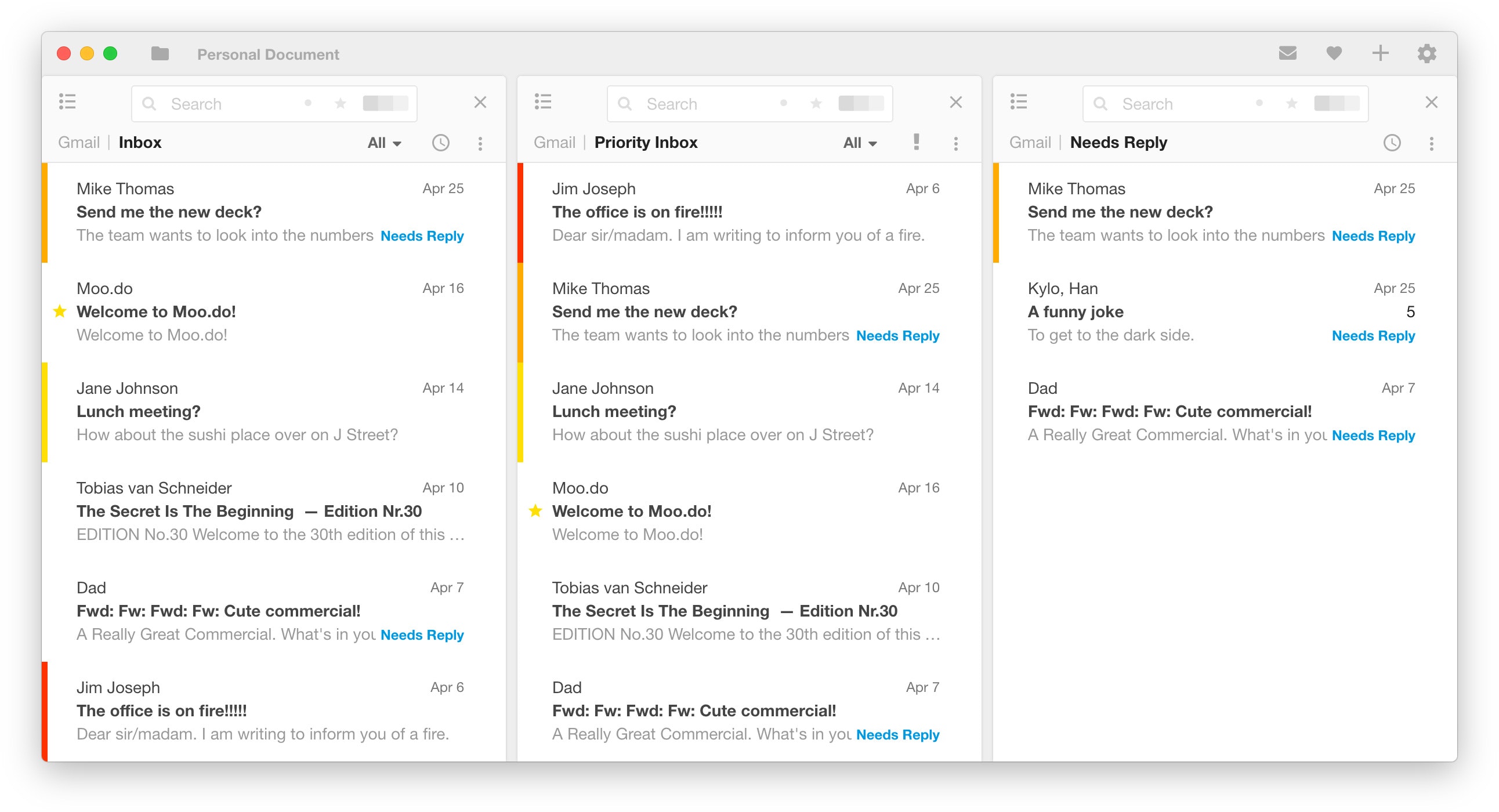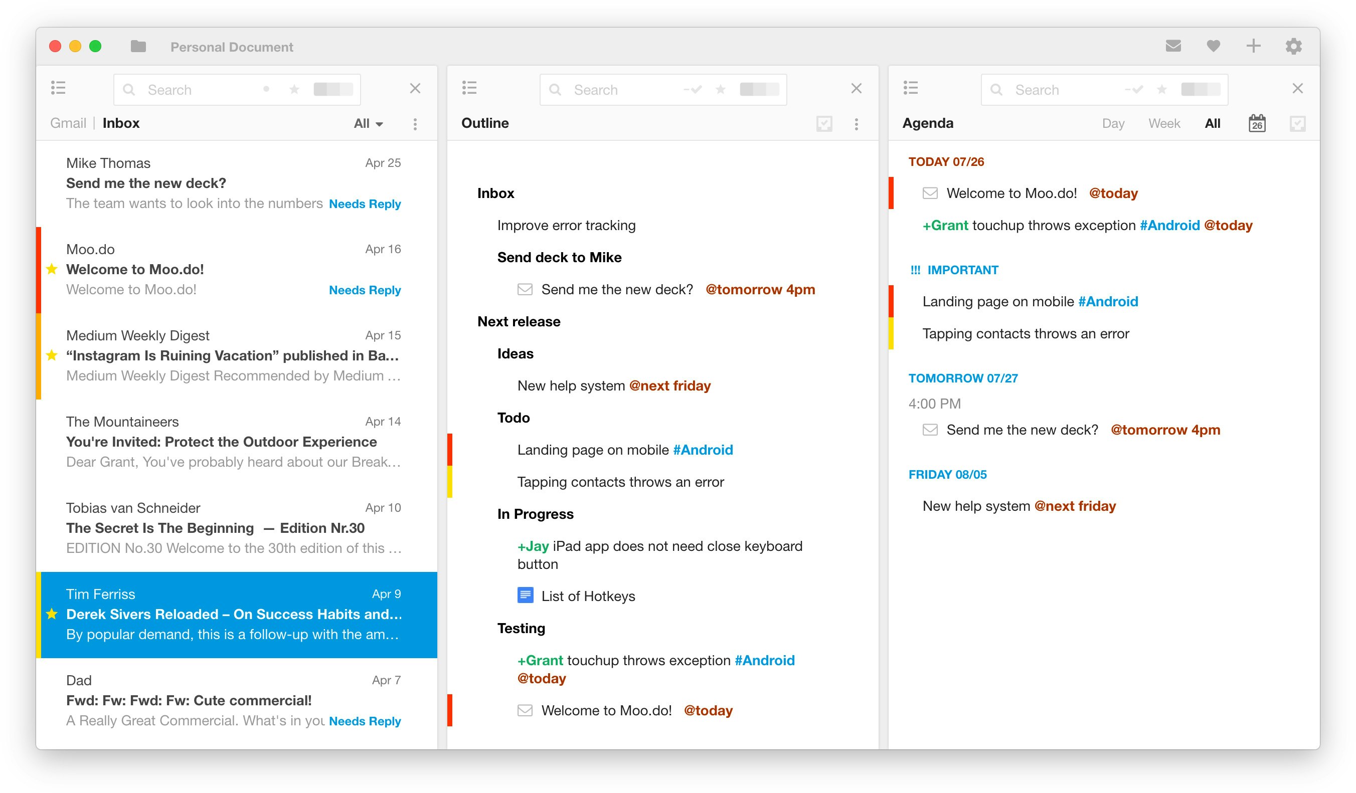 You already use email as a todo list, except all your tasks are created by someone else and you can’t prioritize or rearrange them. So we embraced email’s todolistyness and built an email client inside of a powerful task manager, giving email all the tools of a powerful task management system.
