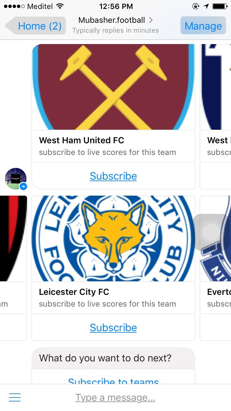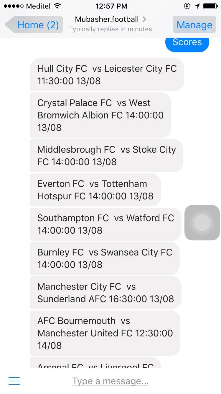 Mubasher is a chatbot that will send you live score updates when your favorite teams play. Only the teams you subscribe to and you can unsubscribe at any time. You can also view a league table and results for the week. It's a none commercial project, happy to answer any questions.