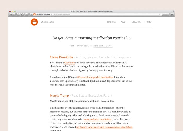 If you want to publish a detailed version of your morning routine I’d love having you aboard (http://mymorningroutine.com/part...). We’re fairly scheduled into December, but always have a spot for people like @rrhoover. In fact, Ryan is on our big "wanted list", he’s a rising personality in the s… See more