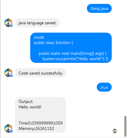 A messenger bot who can compile & run your code on messenger chat itself. Just input the language, code and testcase , and you are done. Running code on the go was never this easy.