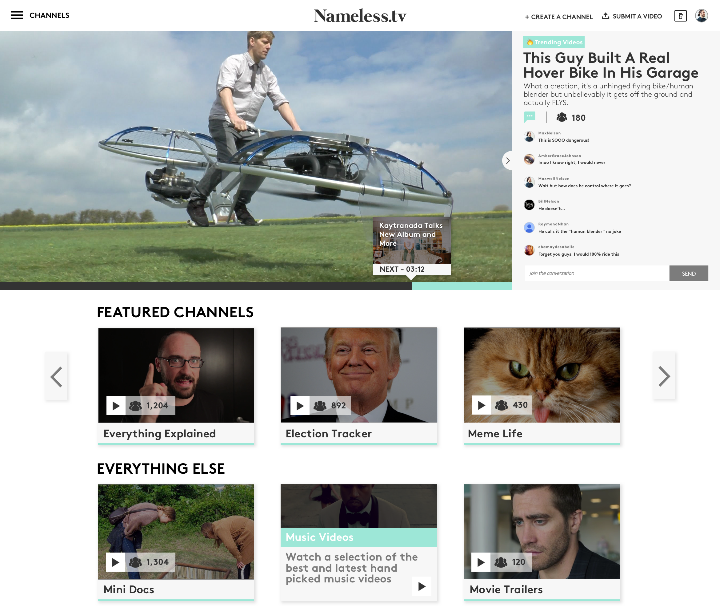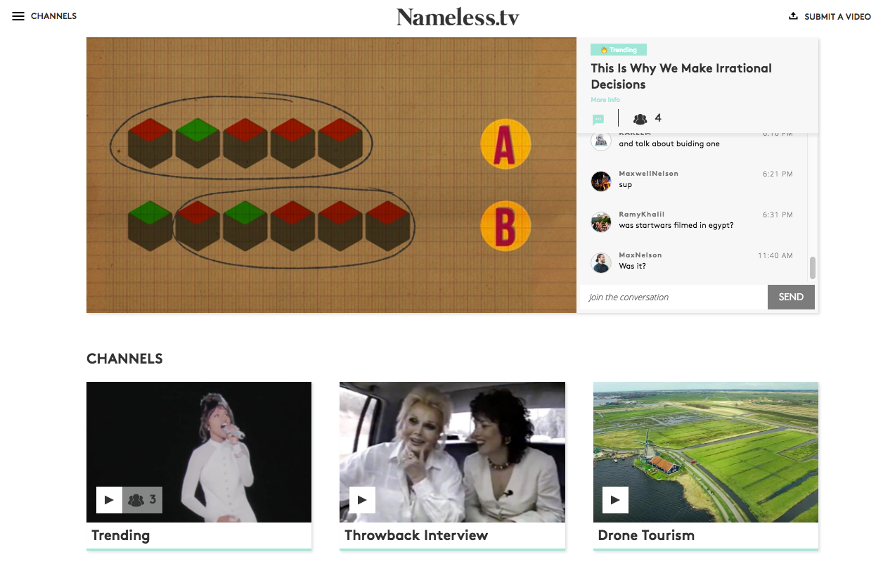 I'm the Founder of http://Nameless.tv. I'm really looking forward to your feedback, questions, and suggestions. We're still in beta and are working on some additional functionality (letting users create their own channels, anonymous chat, etc) but we'd love to hear your thoughts on this version of the product!