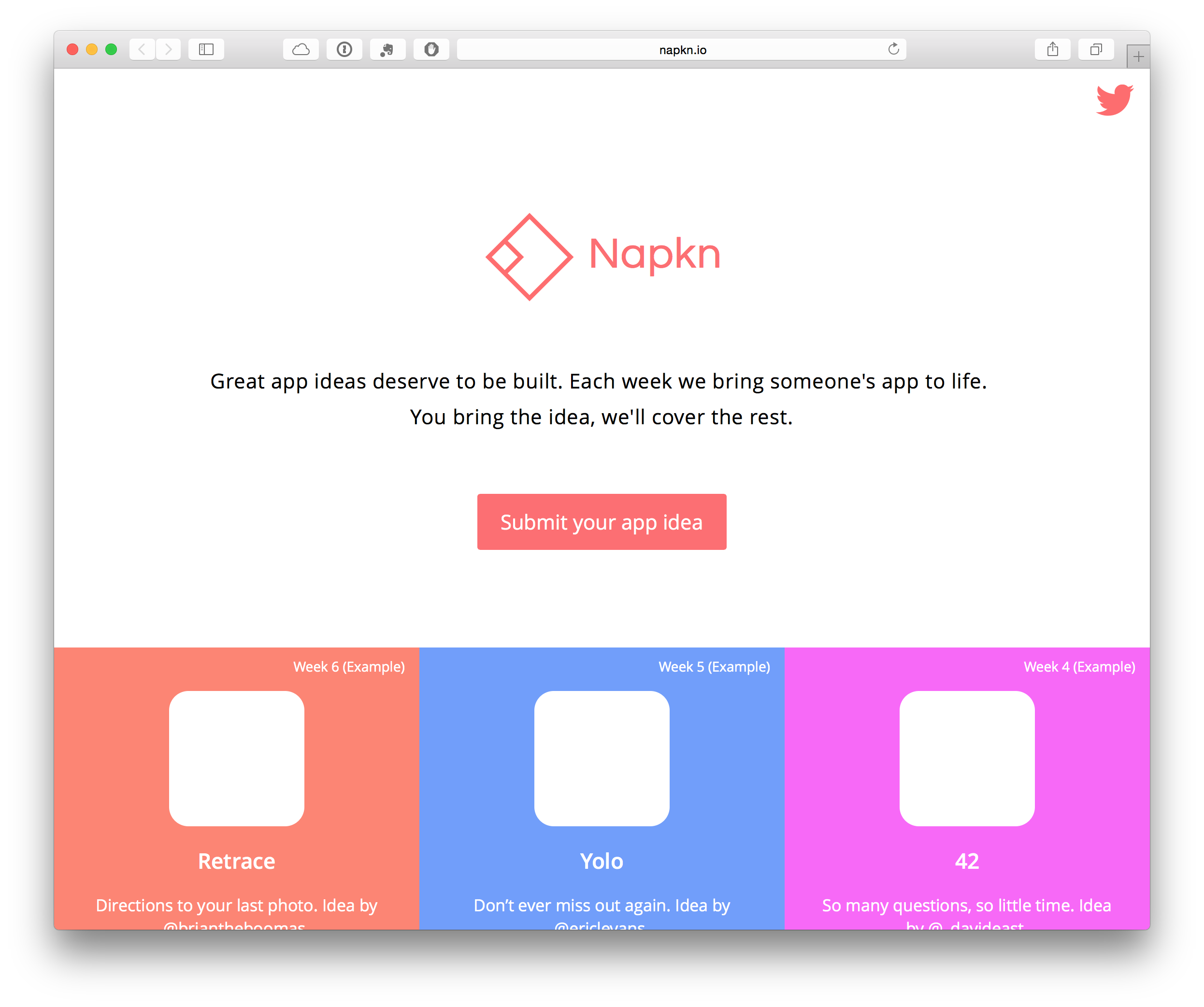 Napkn is a website where anyone in the world can submit their app idea. Each week they'll select the best idea and build it for free.