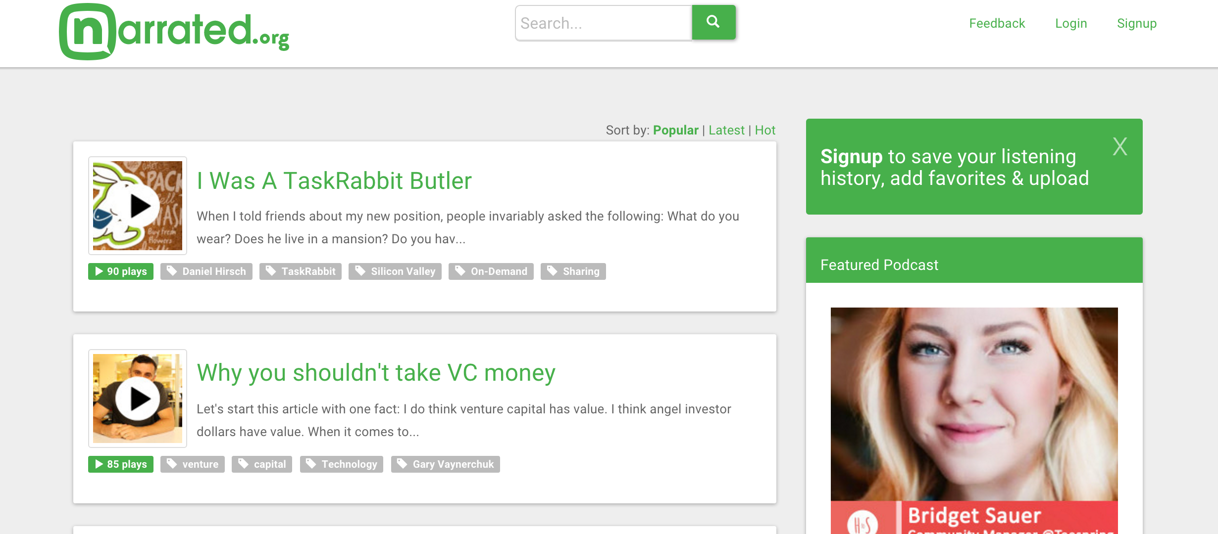 Rich and I have been tinkering away in this space on and off for a few months now and realized there's loads of interesting narrations online but no easy way to find them all. So here we are...