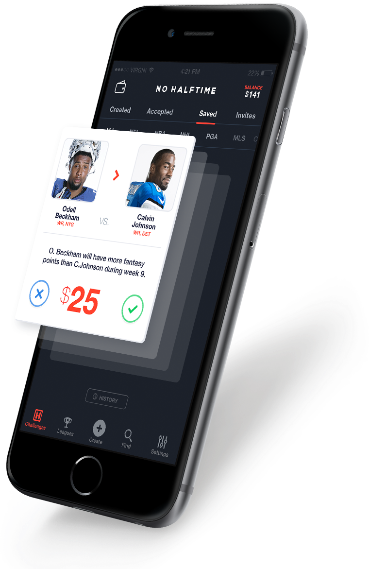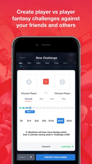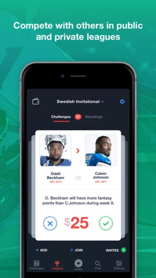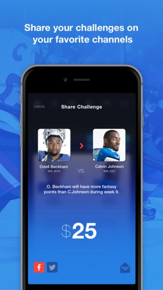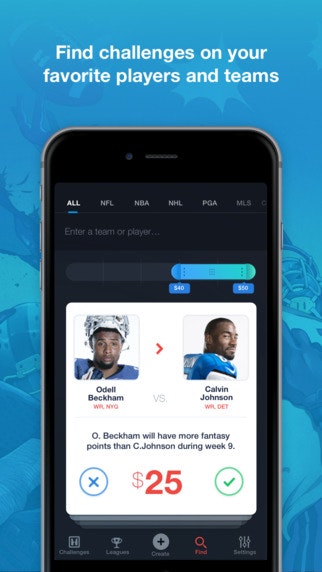 The app allows fantasy users to create challenges on player vs player fantasy sports matchups (e.g. Julio Jones will have more fantasy points than Calvin Johnson). It's different than other offerings in that it focuses on individual matchups and not lineup-based matchups.