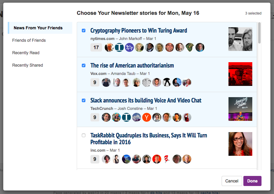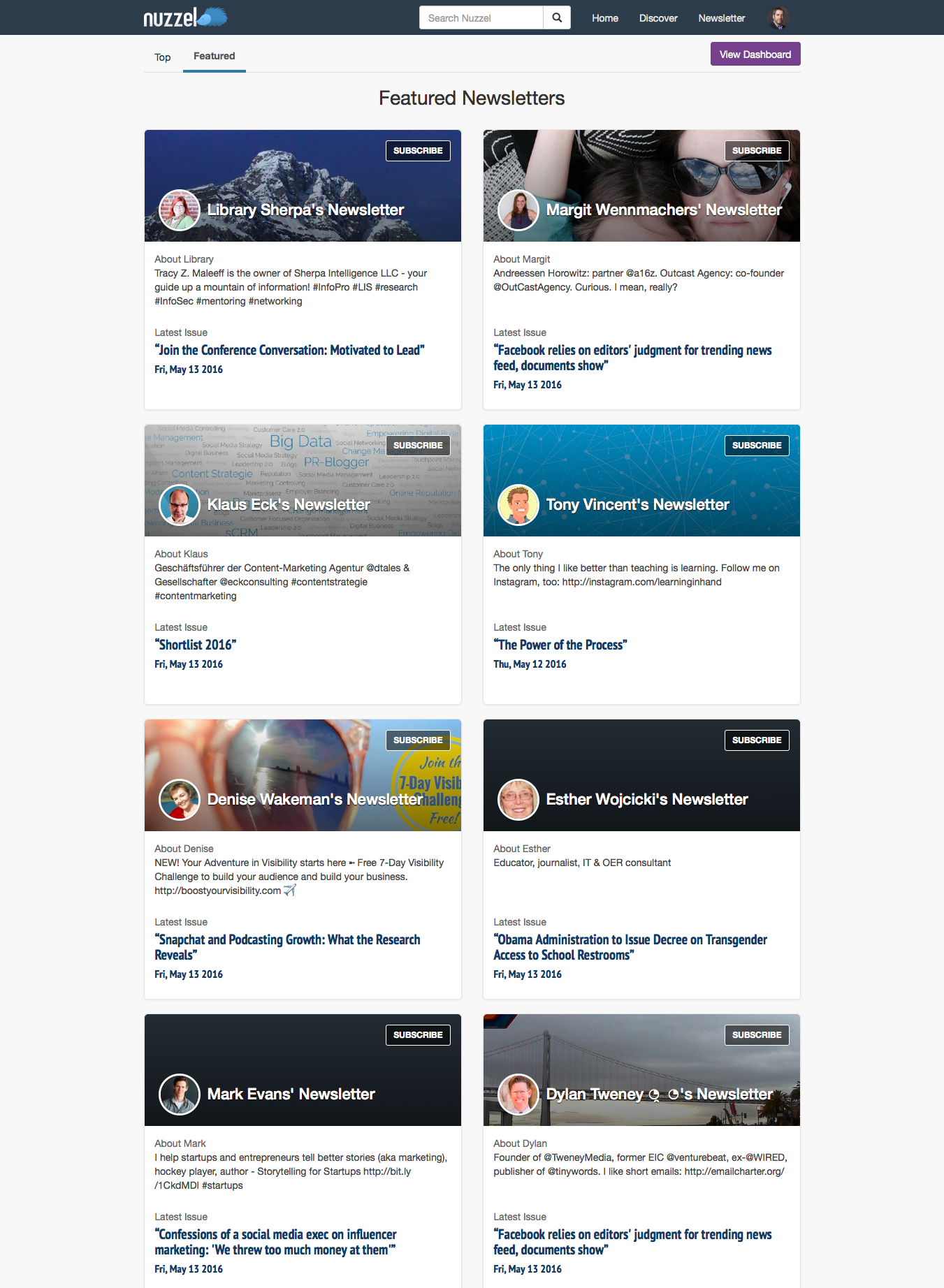 Nuzzel's new curated newsletter platform is the easiest and fastest way to curate an email newsletter. We are building the world's first network of newsletters, aggregating socially curated newsletters from many influencers.