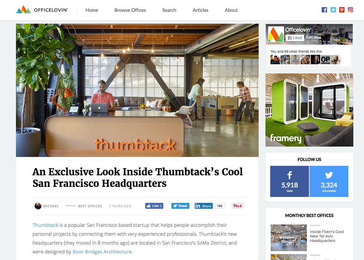 Hi :), this is Michal Ptacek, founder of Officelovin’ - a website that features the best tech & startup offices from around the world. We have just launched Officelovin 2.0 that includes a completely new redesign and some new features such as interviews with architects, as this time we wanted to focus on content much more. Our main goal is still the same though: to showcase the best-looking offices, by cooperating directly with the best architecture & interior design firms from around the globe. So far we have featured over 1,200 offices of companies such as Airbnb, Dropbox, Etsy, Uber, HBO, WeWork, Spotify, and many others. By the way :), there is also ProductHunt’s San Francisco office which we featured a while ago https://www.officelovin.com/2015...