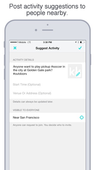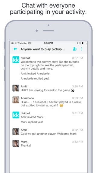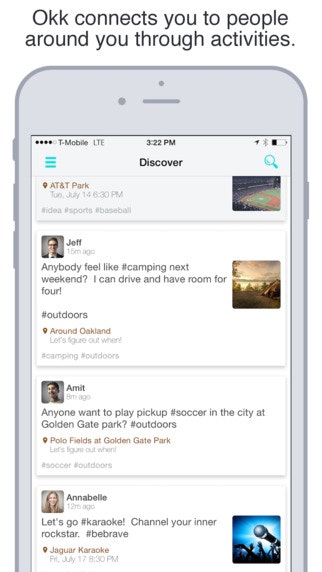 Okk (“oh kay kay”) lets you create instant activity groups. Post activity suggestions and find people in your city who are interested in the things you want to do -- share a drink, pick up a new hobby, or both! Anyone can request to join your activity, but you decide who to invite. Use group chat to figure out details and share pictures.