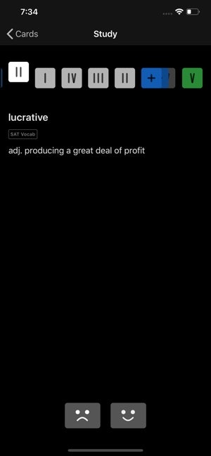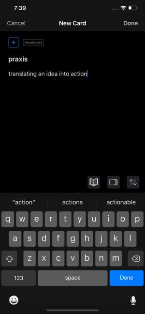 Vocabulary Definitions — If the front of your card is found in the dictionary, a cute little dictionary button will appear in the toolbar. Tapping this will reveal a list of definitions. Selecting a definition from the list will set the selected definition as the card’s back and add the card to a Vocabulary deck.