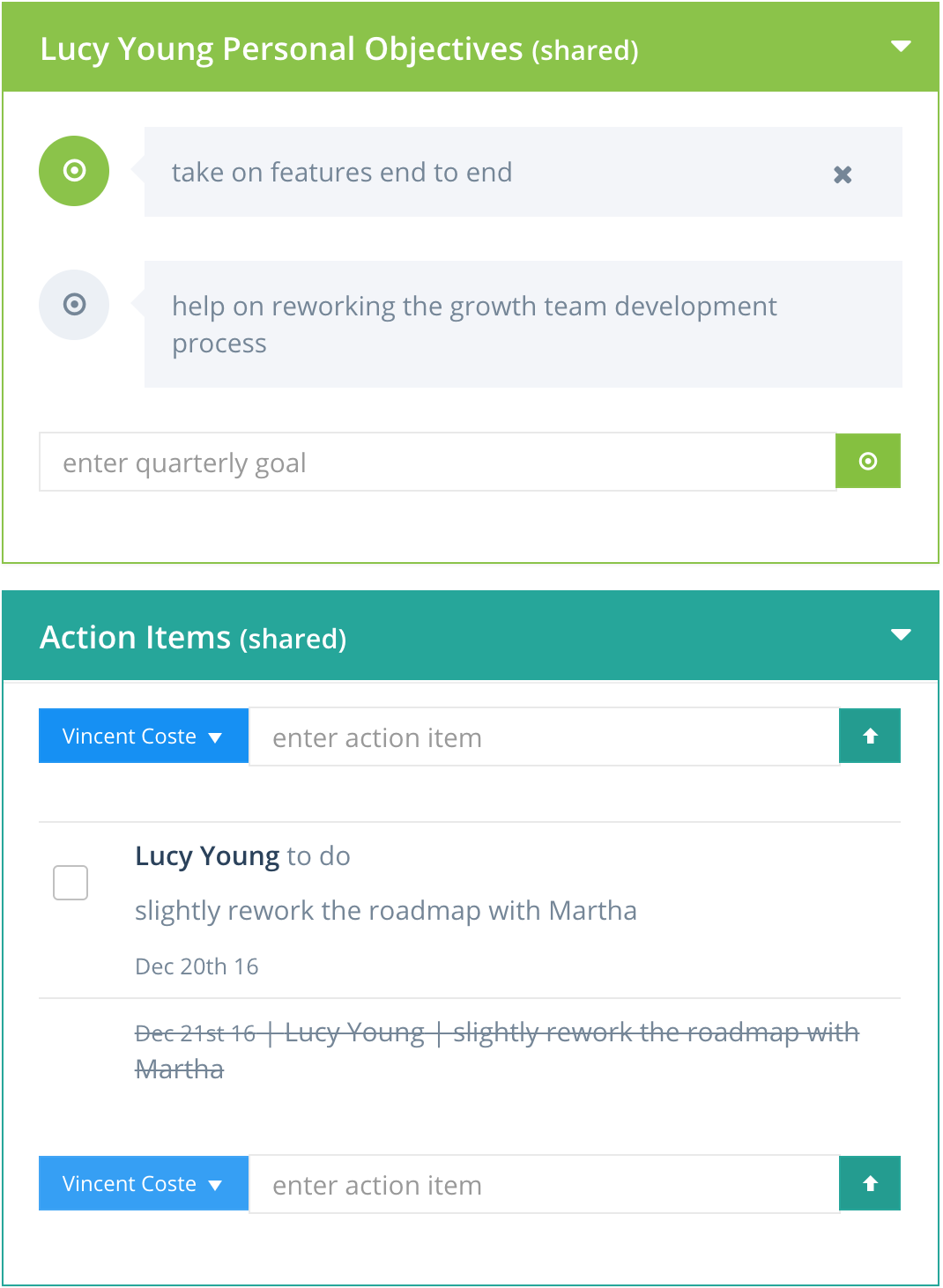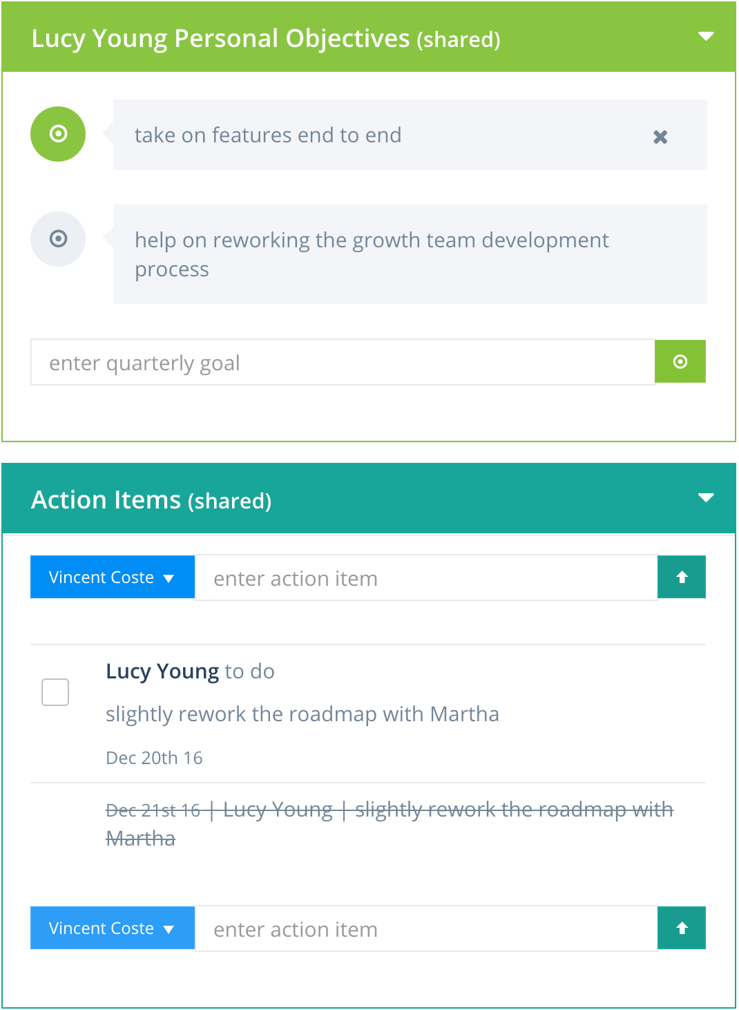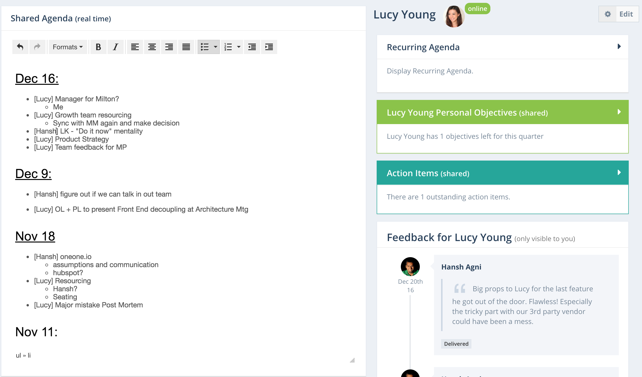 I use this to manage the one on ones with my team. Makes it really easy to have a prepared agenda and keep track of action items in between one on ones.