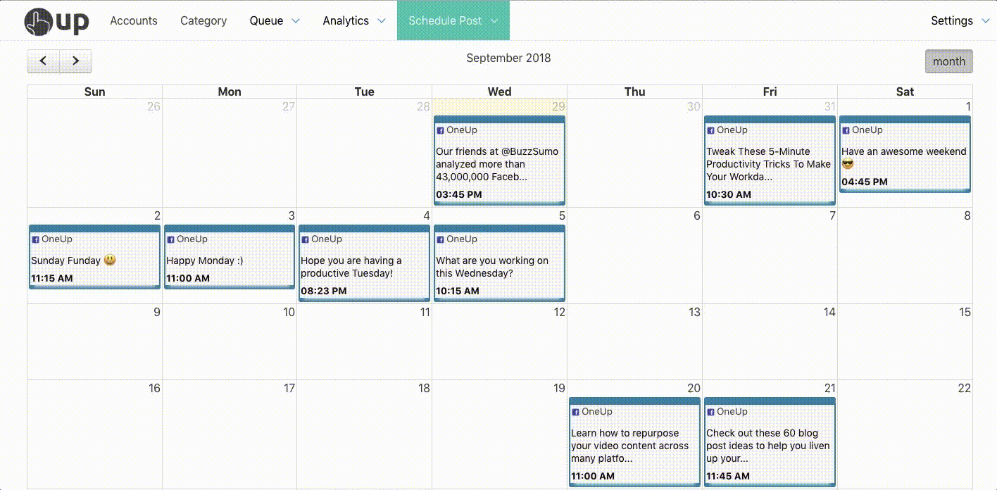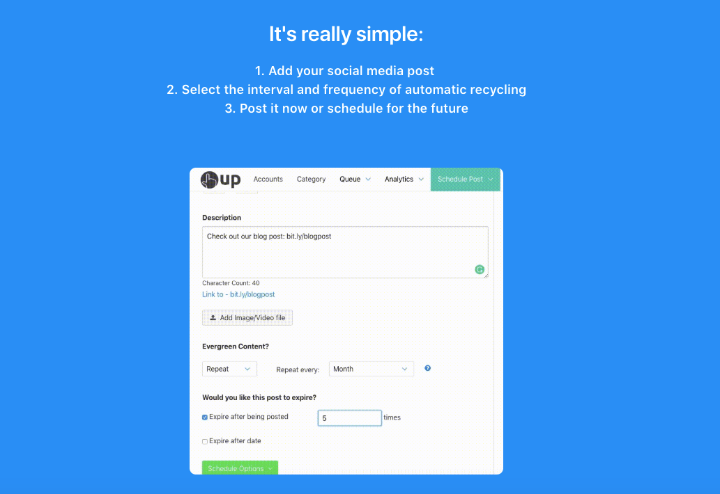 OneUp 2.0 is a tool to schedule and automatically recycle your evergreen content on social media.