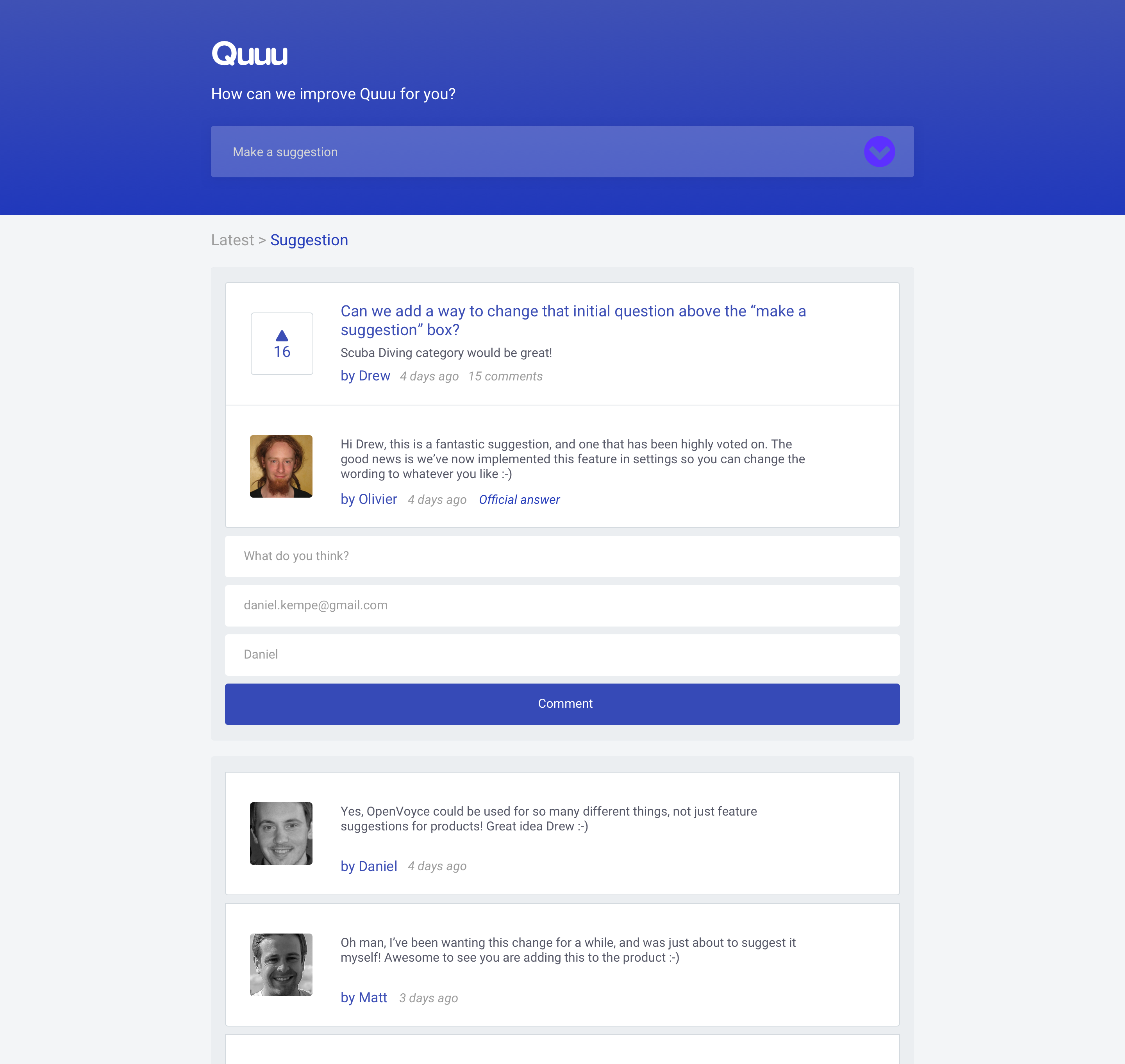 Glad to see you guys on here! I've been a happy user for about a month now. Love the simplicity of it, I think it's a perfect fit for a lot of small/med companies that just want to implement something like this quickly without the cost of UserVoice. Over the last month, I've seen quite a few new ideas implemented from their own page and had excellent support… See more