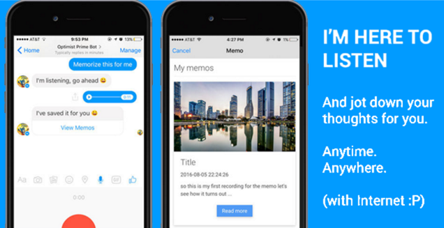 I appreciate that this is open source... seems more like a proof of concept though rather than an actual product... "Optimist Prime is a Facebook Messenger Bot that supports Voice Recognition, Natural Language Processing and features such as: search nearby restaurants, search trending news, transcribe and save memos to the cloud. It also save user data (with… See more