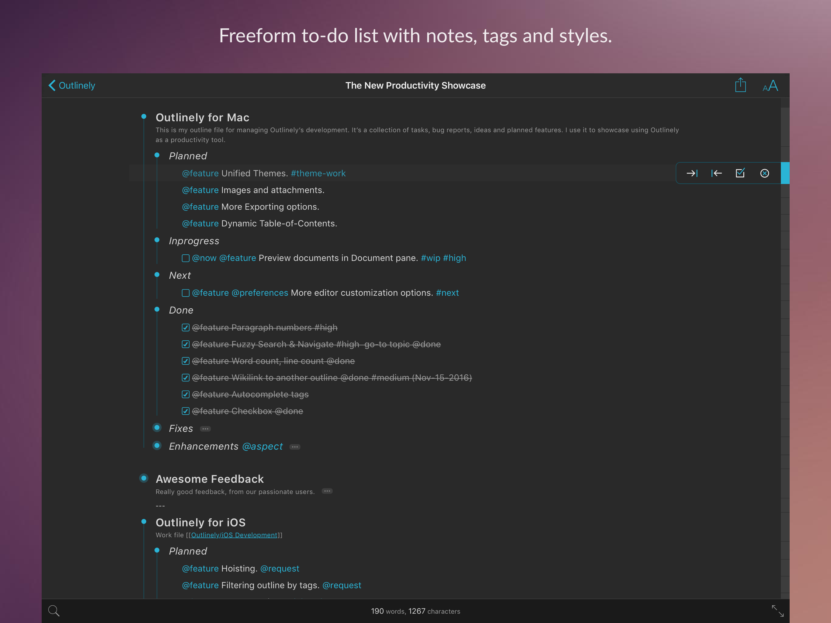 Edited for grumpiness in original post: This looks a bit like a copy of workflowy to me, although with more bells and whistles. I've got to say that I've ditched most of my SAS subscriptions in this field, returned to paper notebooks and have never been happier. I am, for now, keeping my Evernote account going, but even that is under evaluation.