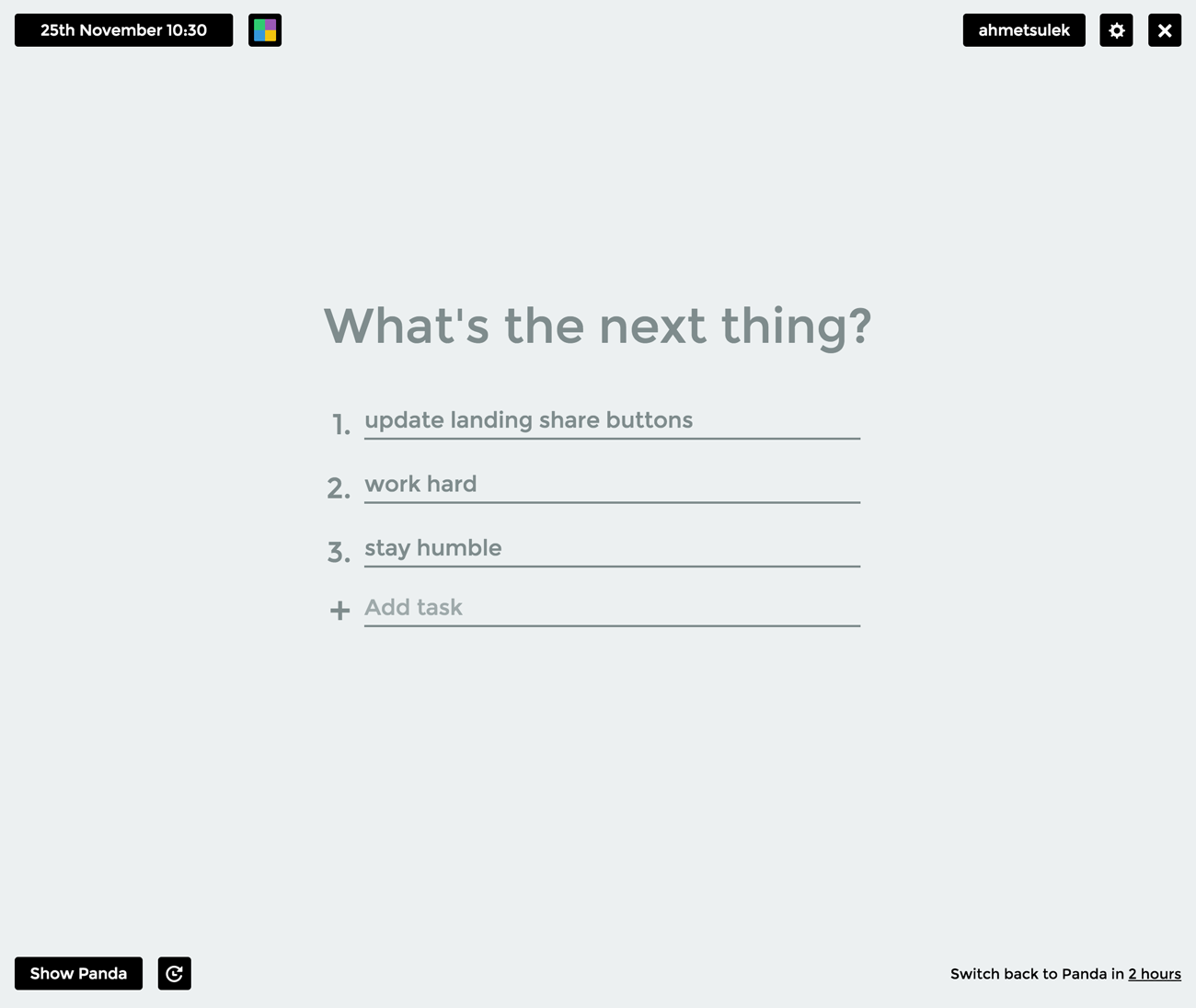 Enter your daily tasks, see them every time you open a new tab. Follow your progress throughout the days and don’t worry Panda will still be available if you want to get a quick update on what’s trending. You can read more about it on Medium > https://medium.com/@usepanda/pan...