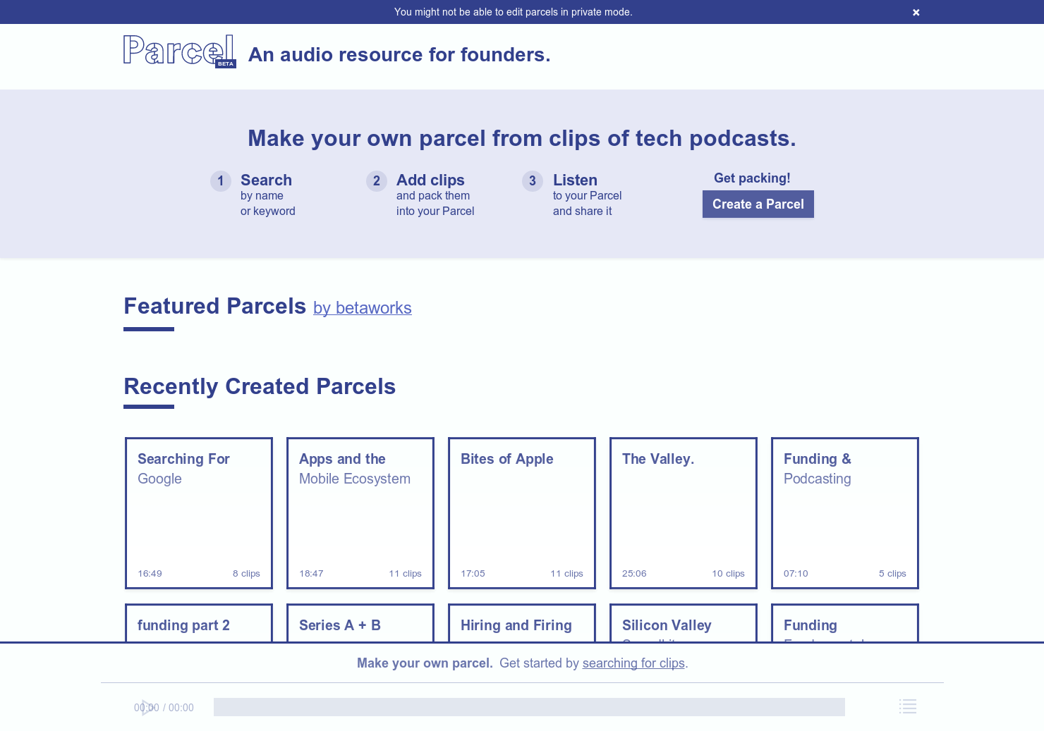 Today we are launching a little beta called Parcel. It's an experiment to see if there is a simple way to cut up bits of podcasts and turn them into your own mixtape. This is a side project, we know it's by no means finished but we'd love you guys to play with it and give us some feedback. Thanks.