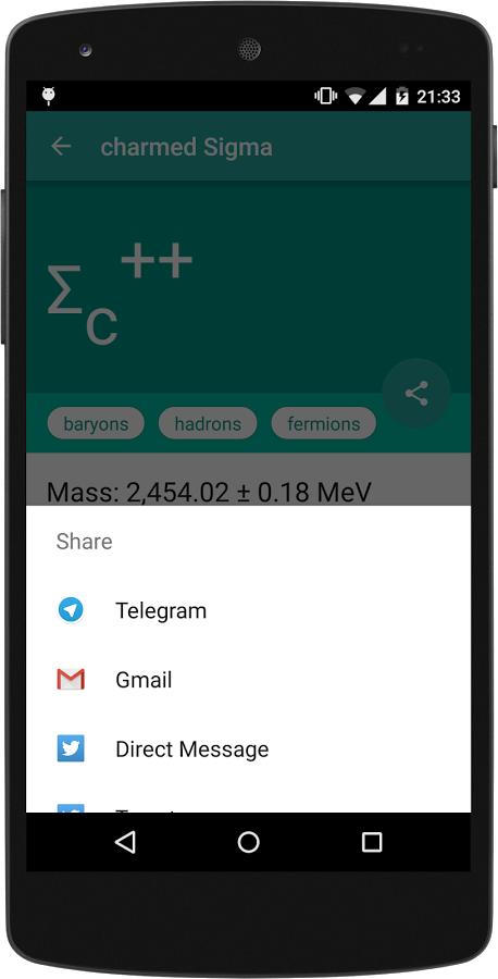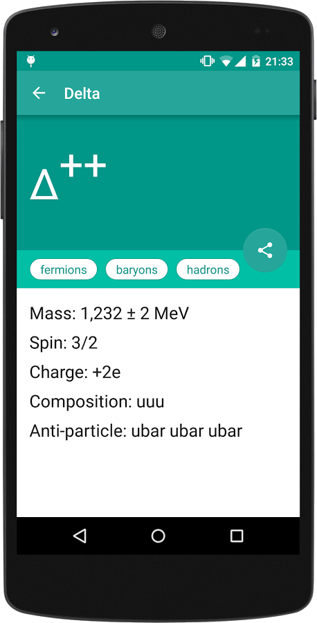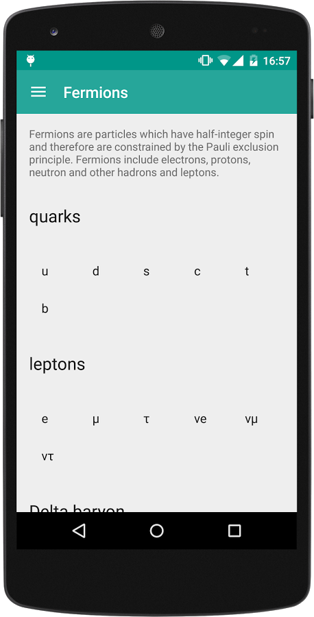 I have a friend who has an interest at quantum physics. He said that it is hard to memorize all particles and their details. I decided to create a material gallery of particles. In this app, you can find information about nearly hundred fundamental and composite particles. They are also categorized according to their mass, spin number, and internal structure.