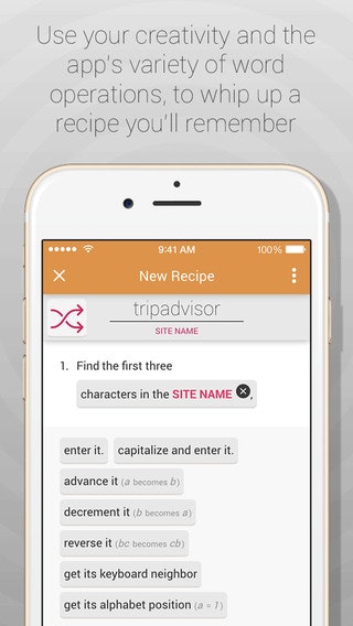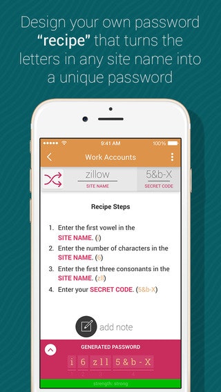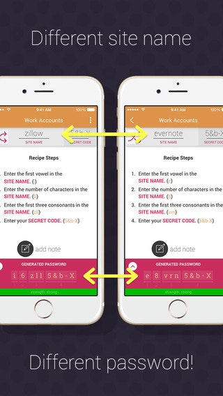 I use a similar concept in my head to generate passwords for the sites I visit often. But this app helps me to take it to another level, and so set & recall different password obfuscation techniques. NB: This is not another password vault app, rather it lets you create a 'recipe' for creating an easily recallable unique password for each site/app you u… See more
