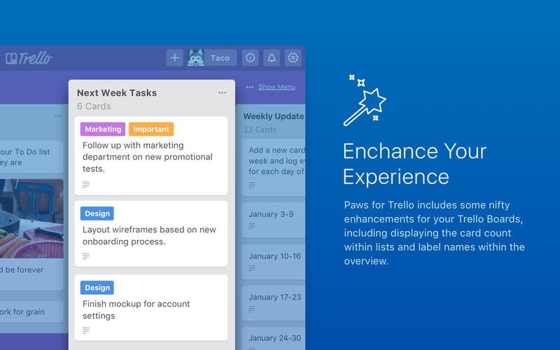Paws is a desktop app for Trello. It's great if you like your Trello away from your browser, and we've added a lot of extras on top of an already great product!