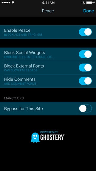 I haven't had a chance to use 'Peace' yet, but it’s powered by Ghostery, Ghostery is still owned by a company (Evidon) that collects and sells data to advertisers.