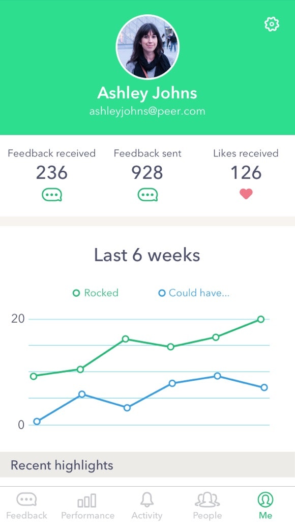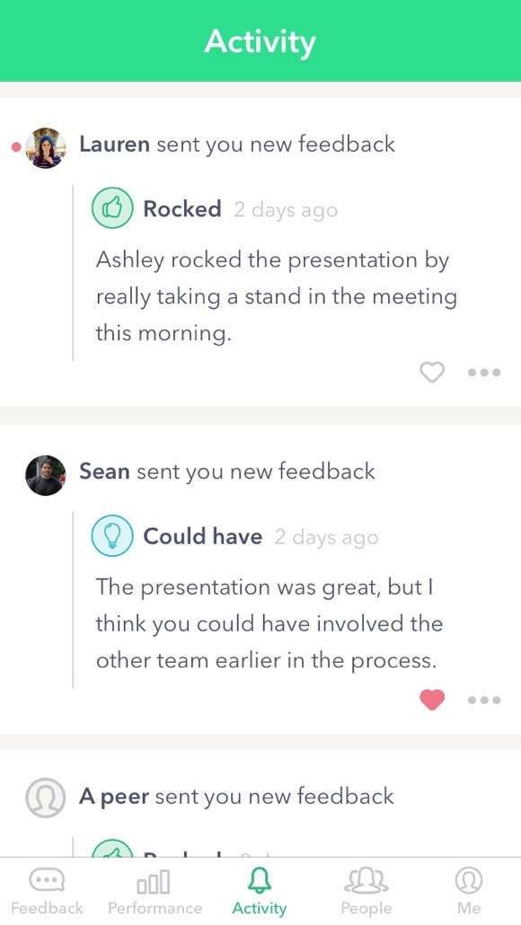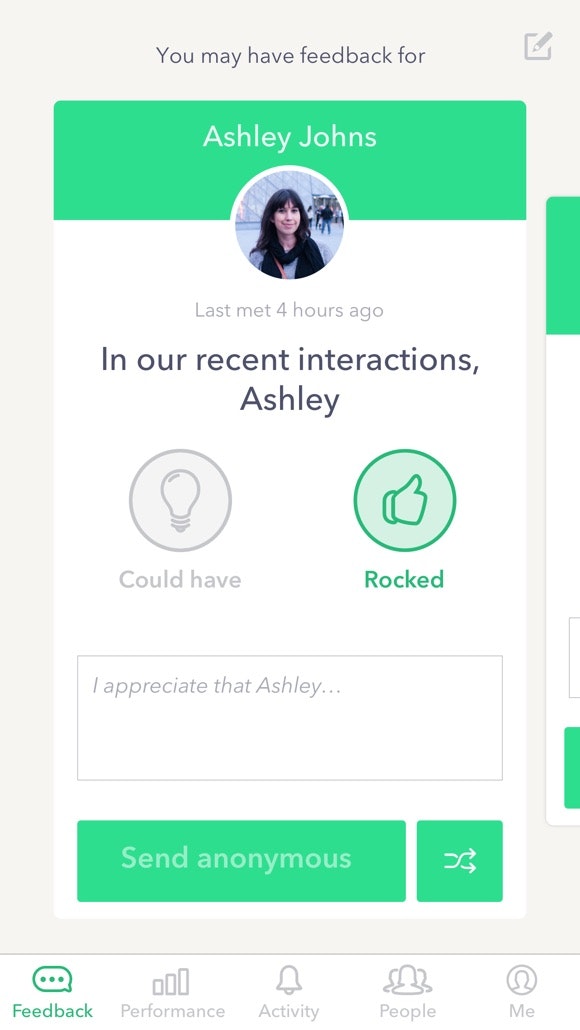 Launched by the COO of Salesforce. From the BI article: "The way it works is pretty straightforward. The app links to the user’s calendar and starts prompting them for individual feedback. You get to choose if a recent “interaction,” like a meeting or phone call, select if it was good or bad, and then leave private comments that show up in individual timelin… See more