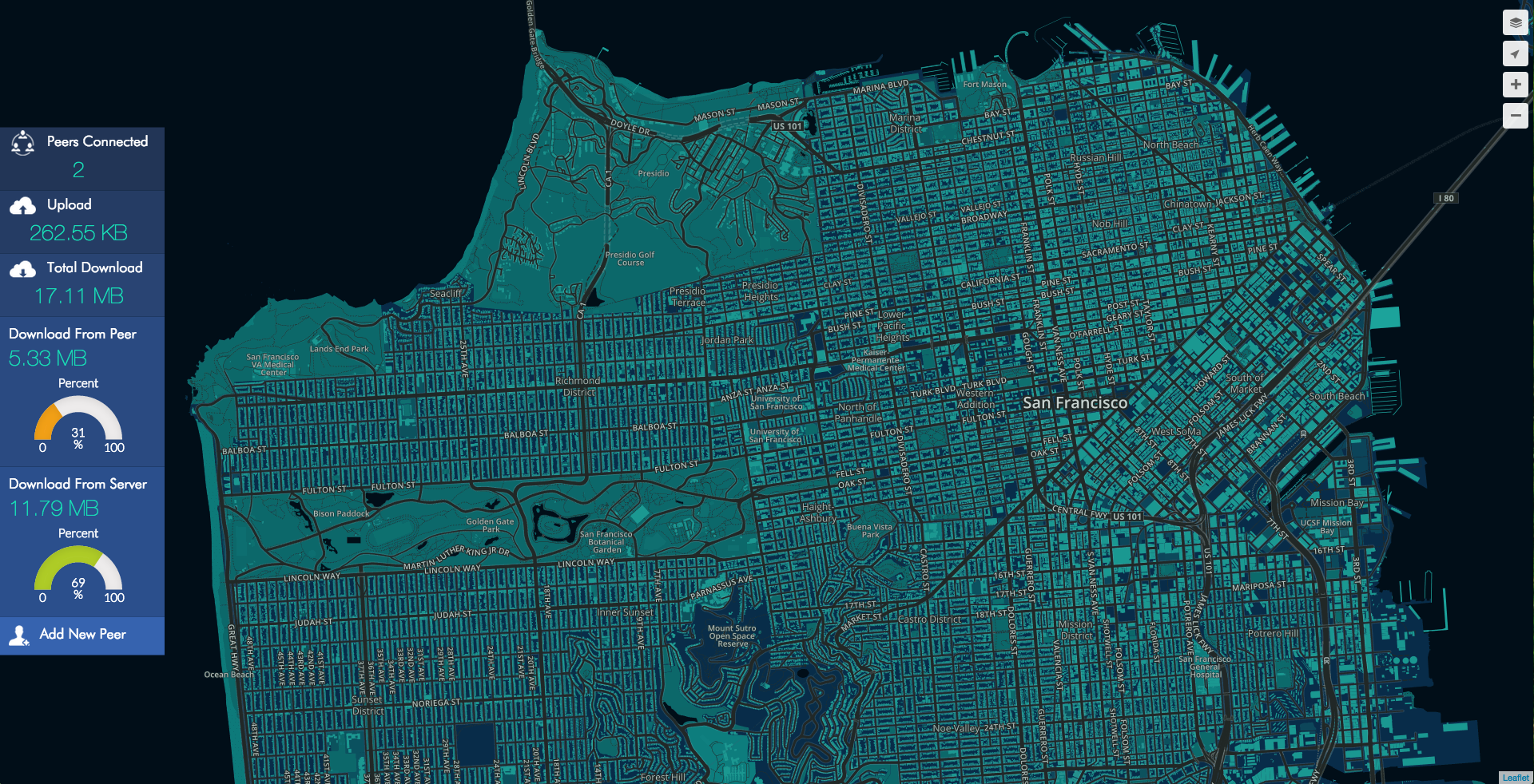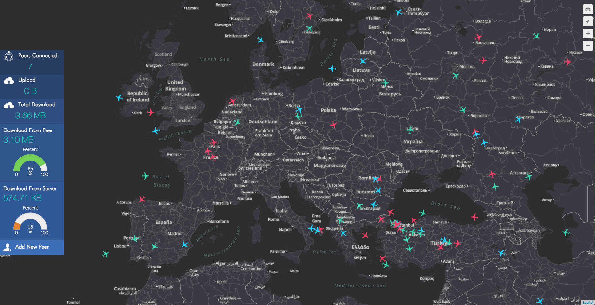 This is a pure javascript library for p2p sharing that is using WebRTC technology to reduce bandwidth costs up to %90. This technology enabled us to distribute GIS data tiles between the peers on both 2D and 3D GIS systems
