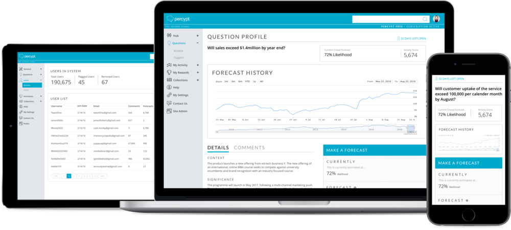 Percypt is a platform that combines people’s collective intelligence into more accurate forecasts. How much more accurate? 30%-80% more accurate.