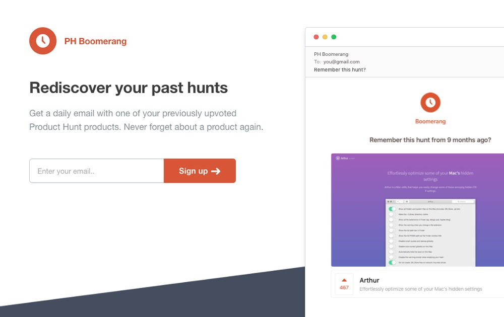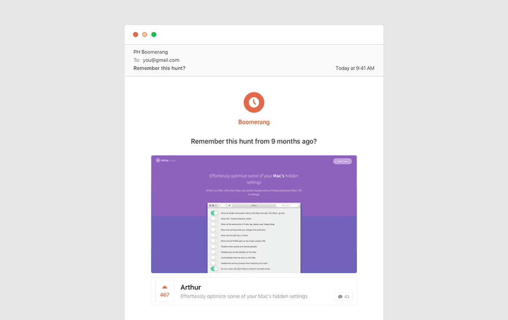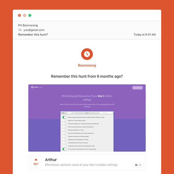 I built this email app because I found myself forgetting about great products that I upvoted on Product Hunt. Personally, I treat my upvotes like bookmarks, with the thought that I will revisit them in the near future. However, I never take the time… See more