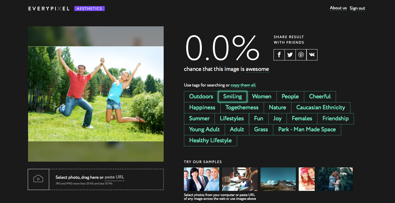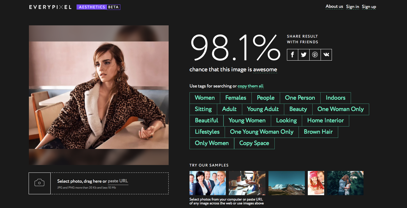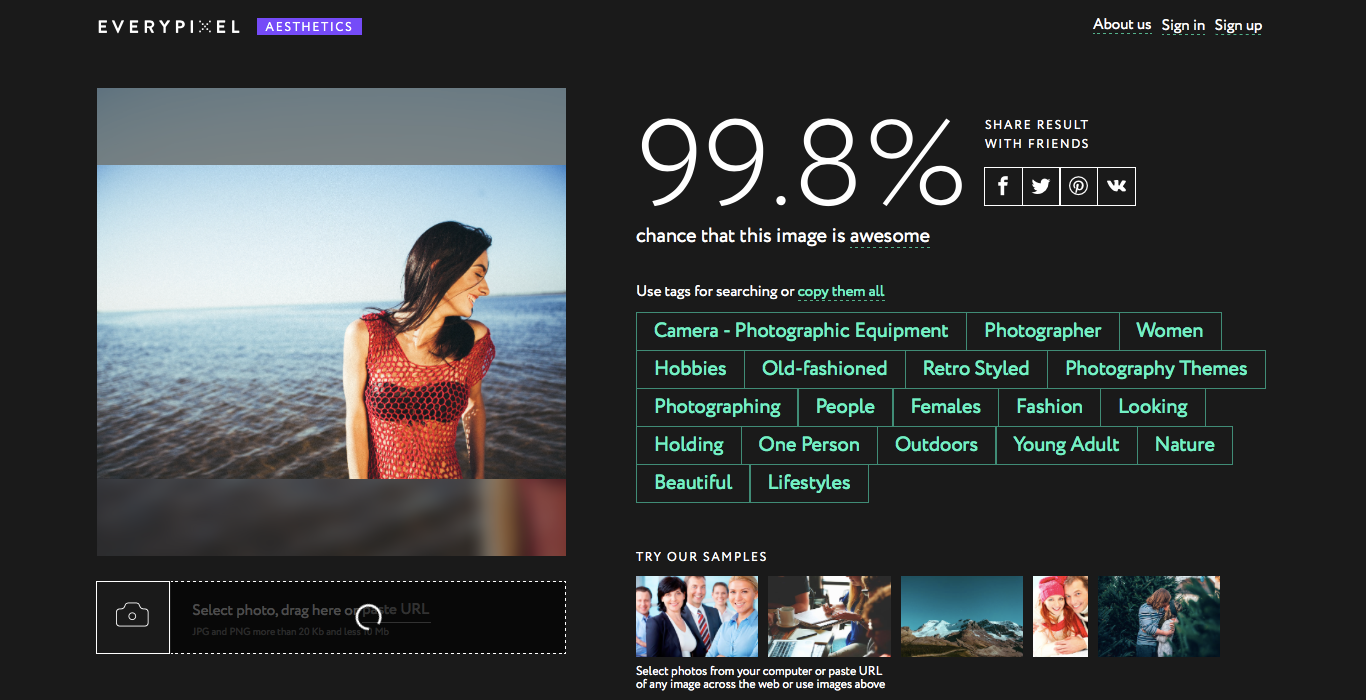Everypixel team is happy to introduce you to our latest product - Photo Aesthetics Tool. It is a humble, but powerful service with AI under the hood. It rates photos according to their aesthetic value.