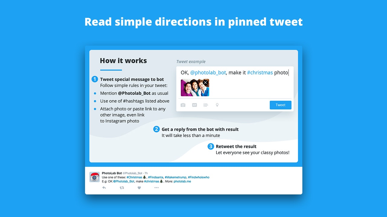 I’m proudly introducing you Twitter @Photolab_bot which will add visual effects if you tweet it a picture of your choice. The bot is all brand new, we've launched it yesterday, so for now it can get you a bunch of Christmas effects (xoxoxo).